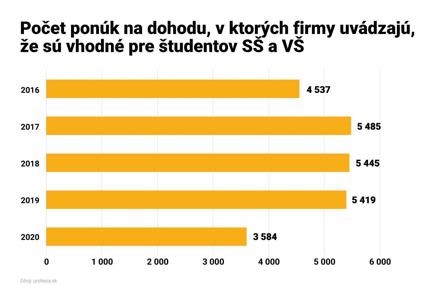 3584. Toto je celkový počet brigádnických ponúk za minulý rok, v ktorých firmy uverejnili, že hľadajú študentov stredných či vysokých škôl. Oproti roku 2019 ide o pokles až o tretinu.