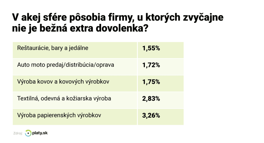 Extra voľno nad rámec zákona nie je ako benefit častý ani vo firmách, ktoré sa zameriavajú na predaj či opravu automobilov a motocyklov či výrobu kovov, textilu alebo papierenských výrobkov.,