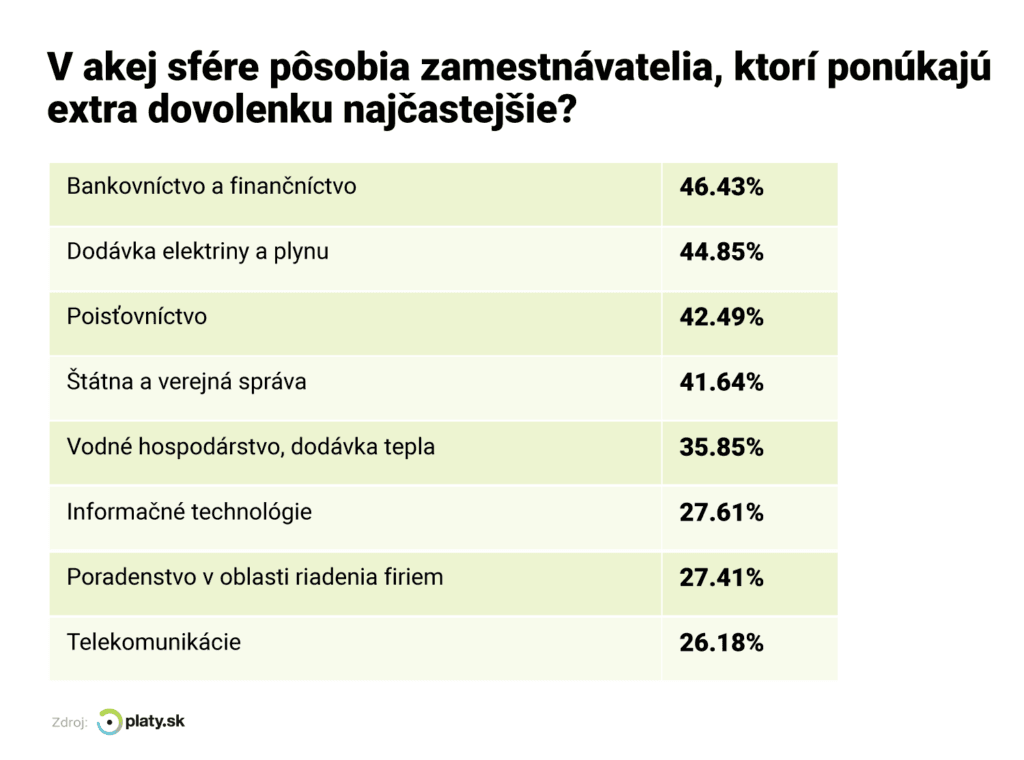 Analýza portálu Platy.sk odhaľuje, kde pracuje najväčšia časť zamestnancov a zamestnankýň, ktorí majú k dispozícii platenú dovolenku navyše. Na vrchole rebríčka sú zamestnávatelia v oblasti bankovníctva a finančníctva. Tento benefit má k dispozícii až 46 percent ľudí, ktorí pracujú pre firmy, čo pôsobia v tejto sfére.