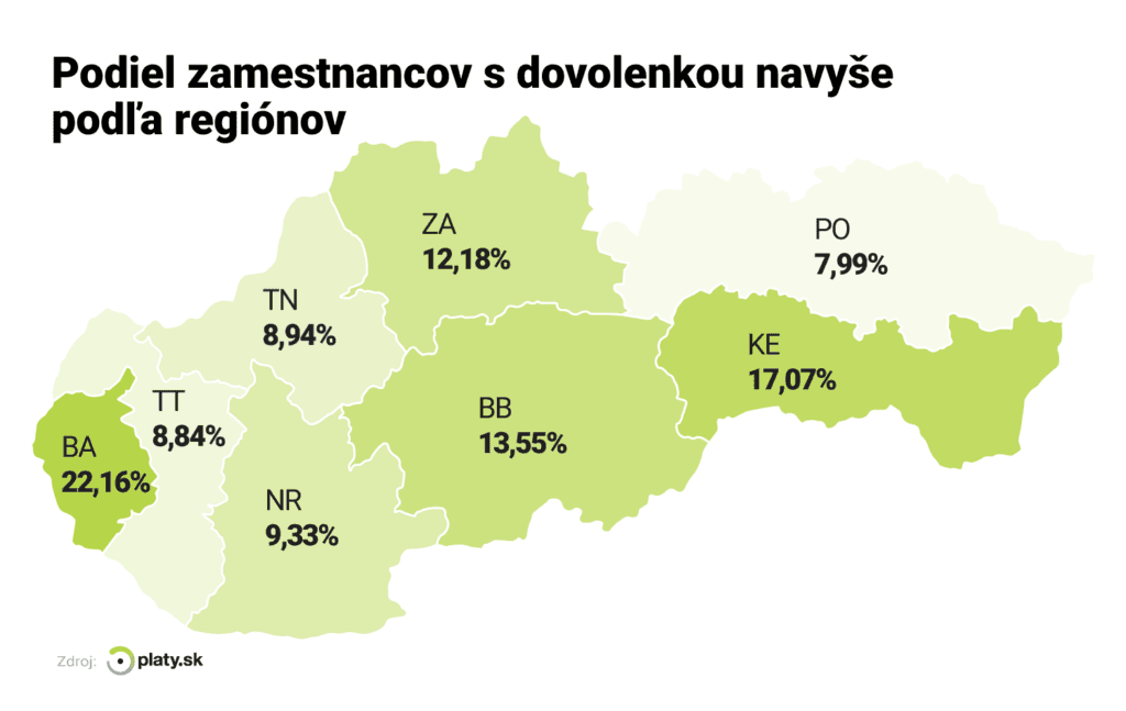 Nie je prekvapením, že dovolenka navyše je najviac rozšírená v hlavnom meste a okolí. V týchto končinách ju má k dispozícií viac ako 22 percent zamestnancov a zamestnankýň. Na druhom mieste je región na druhej strane Slovenska. V Košickom kraji je to zhruba 17 percent.