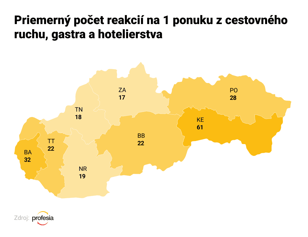 Na jednu pracovnú ponuku reaguje v priemere 30 uchádzačiek a uchádzačov. Najväčší záujem o prácu v cestovnom ruchu, gastre a hotelierstve je v Košickom kraji, na jednu aktuálne zverejnenú ponuku reaguje viac ako 60 ľudí, o polovicu menší záujem je v Bratislavskom kraji. V priemere 28 reakcií prichádza na inzeráty z Prešovského kraja.