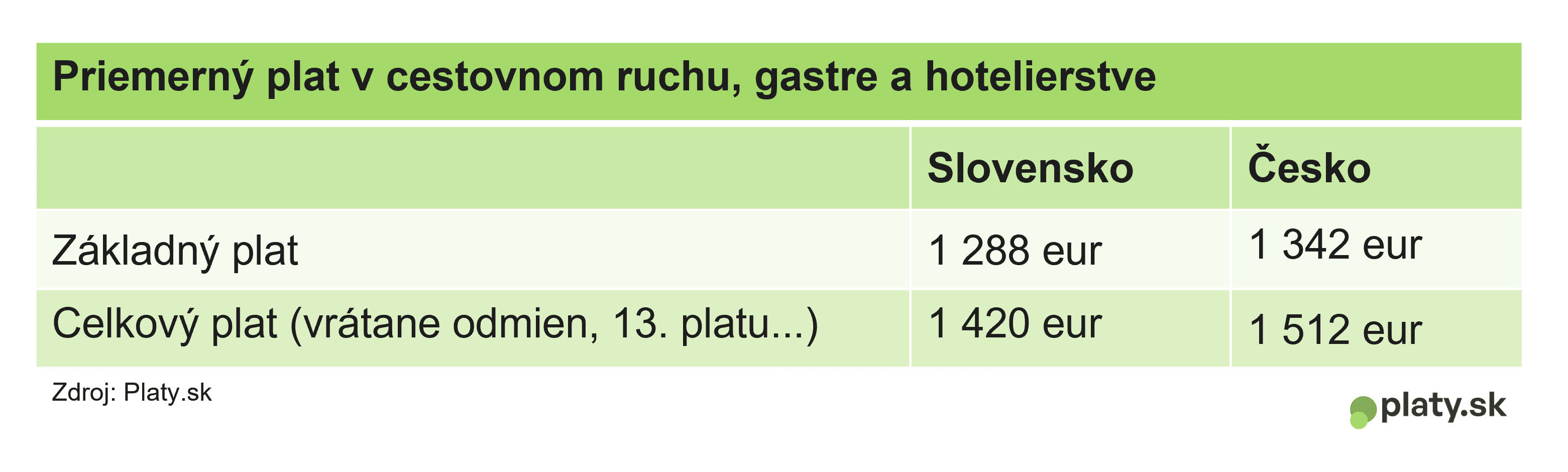 Priemerný základný mesačný plat v cestovnom ruchu, gastre a hotelierstve je na základe dát portálu Platy.sk 1 288 eur. Po pripočítaní bonusov a odmien zamestnanci a zamestnankyne zarobia v priemere 1 420 eur. Pre porovnanie, dáta portálu Platy.cz ukazujú, že v Českej republike je priemerný základný plat vyšší o približne 50 eur, čiže o 4,2 percenta, celkový zárobok je vyšší o necelú stovku, čo predstavuje 6,5 percenta.