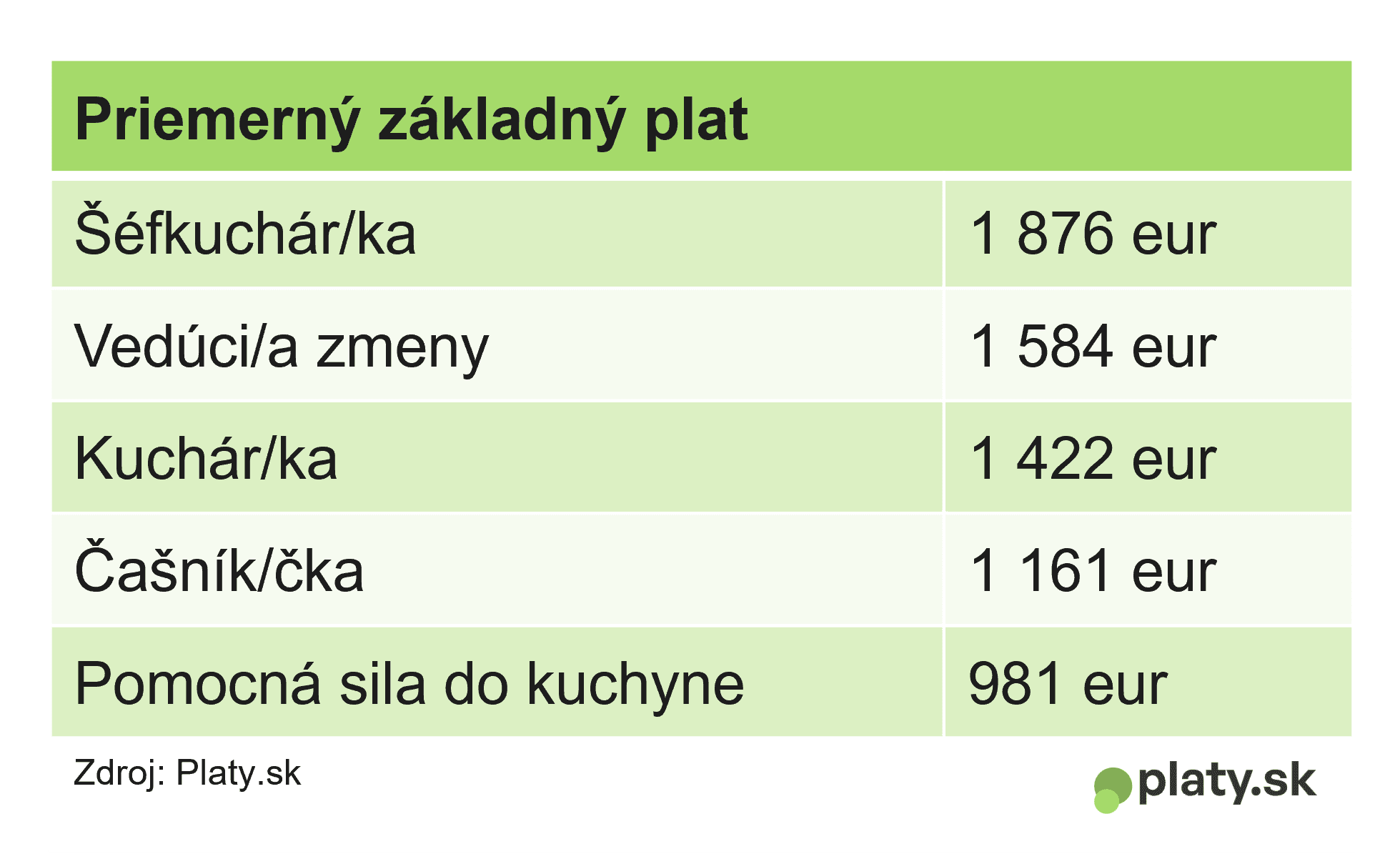 Najviac zarábajú šéfkuchári a šéfkuchárky, ich priemerný mesačný základný plat je takmer 1 900 eur, najlepšie zarábajúca desatina má viac ako 4 000 eur mesačne. Spomedzi najfrekventovanejších pozícií v cestovnom ruchu, gastre a hotelierstve majú nadpriemerný základný príjem aj vedúci zmeny a kuchári.