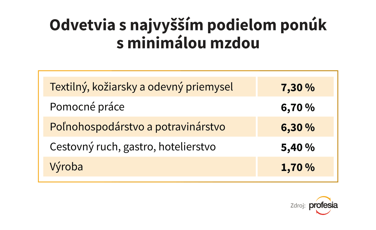 Päticu odvetví s najvyšším podielom ponúk s minimálnou mzdou dopĺňajú ešte cestovný ruch, gastro, hotelierstvo a výroba.