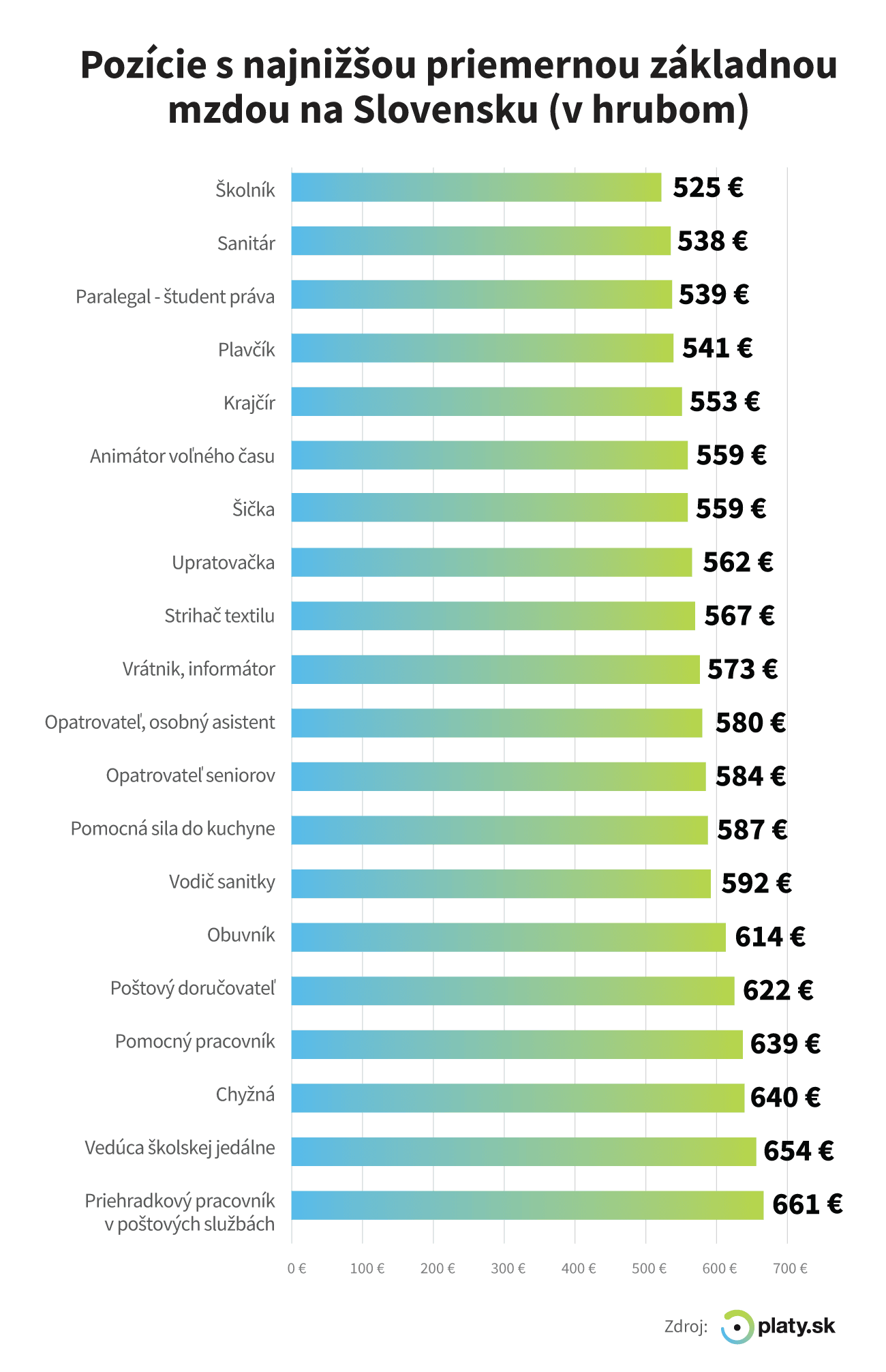 Údaje portálu Profesia.sk dopĺňajú informácie z portálu Platy.sk. Ten zmapoval 20 pozícií s najnižšími zárobkami na Slovensku. V rebríčku obstála najhoršie pozícia školníka. Celoslovenský priemerný základný plat školníka predstavuje 525 eur v hrubom. Iba 5 eur nad stanovenou minimálnou mzdou pre rok 2019.