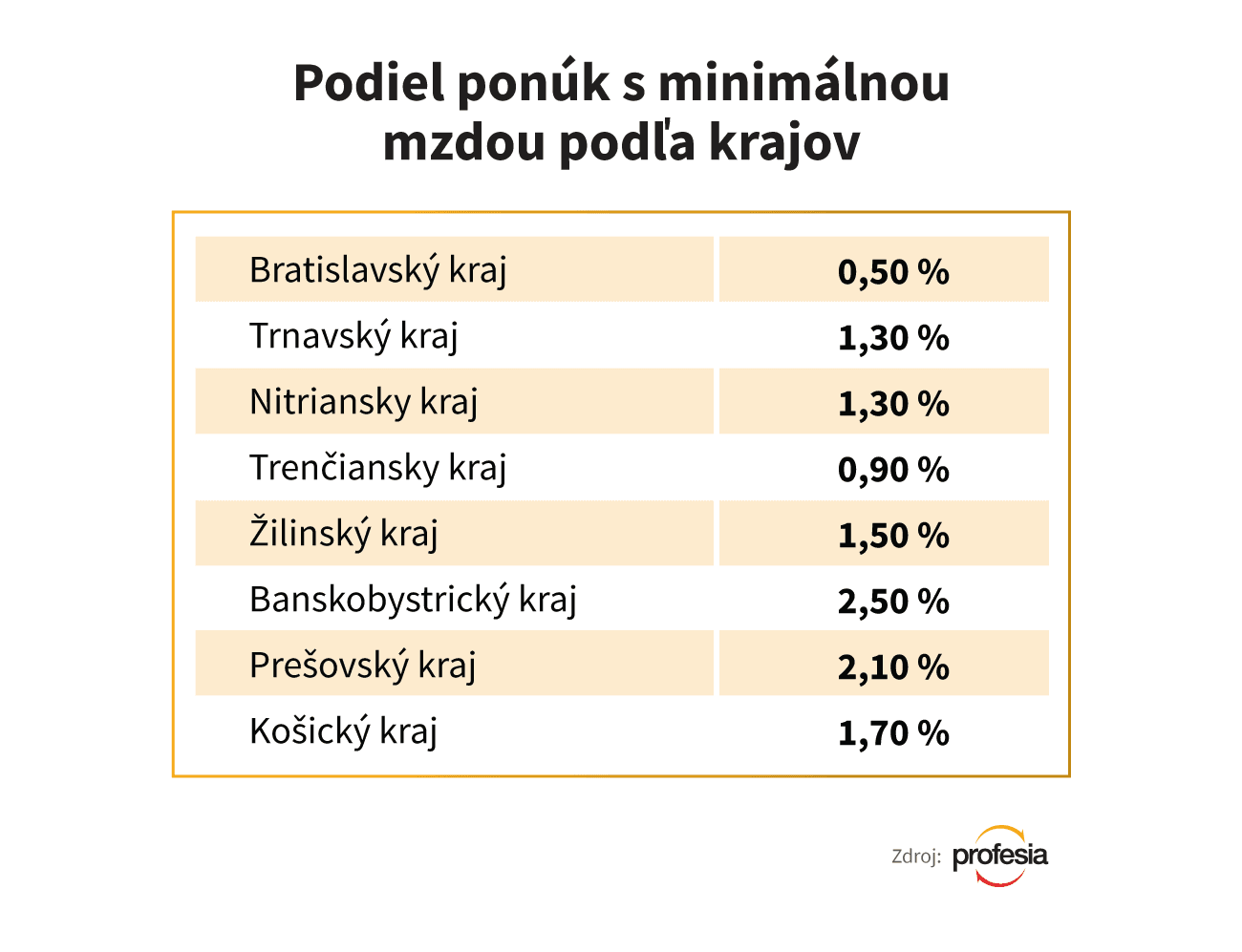Jediným ďalším regiónom s podielom minimálnej mzdy v ponukách vyšším ako dve percentá je Prešovský kraj. Za ním nasleduje Košický a Žilinský kraj.