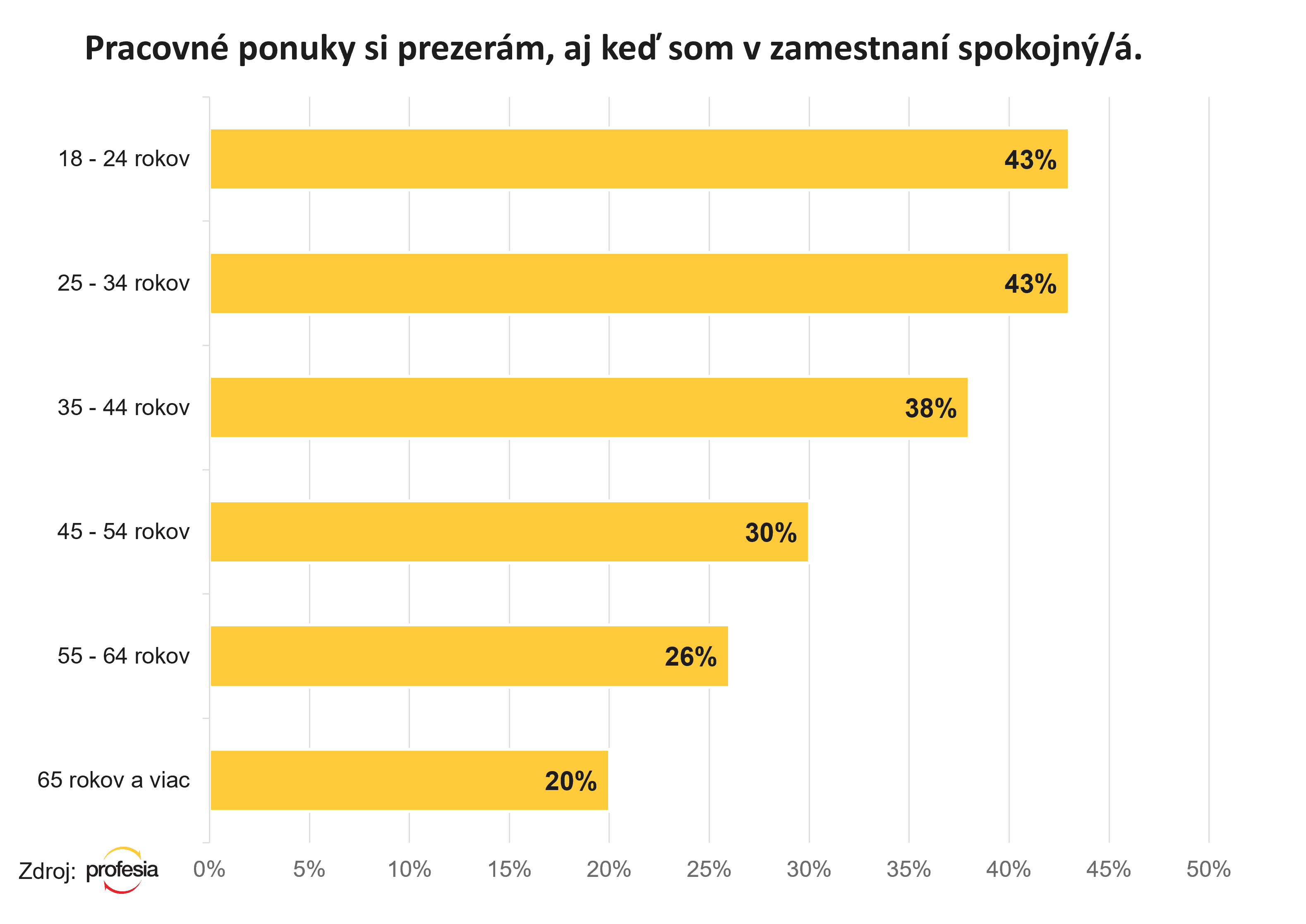 Spomedzi spokojných zamestnancov si najmenej často prezerajú ponuky práce tvoriví odborní pracovníci, naopak najčastejšie výkonní odborní pracovníci a úradníci. Aktivitu vidno u najmladšej generácie na pracovnom trhu, medzi zamestnancami vo veku do 24 rokov, ktorí sú v práci spokojní, si aktuálne pracovné inzeráty prezerá až 43 percent. Najčastejšia motivácia je možnosť nájdenia lepšej ponuky. Potvrdzuje to výsledky iných prieskumov, ktoré poukazujú na to, že generácia Z nie je až taká verná svojim zamestnávateľom a nebojí sa zmeny. Aktuálne informácie o pracovných ponukách chcú mať aj mileniáli, no u nich je najväčšia motivácia prehľad o pracovnom trhu.