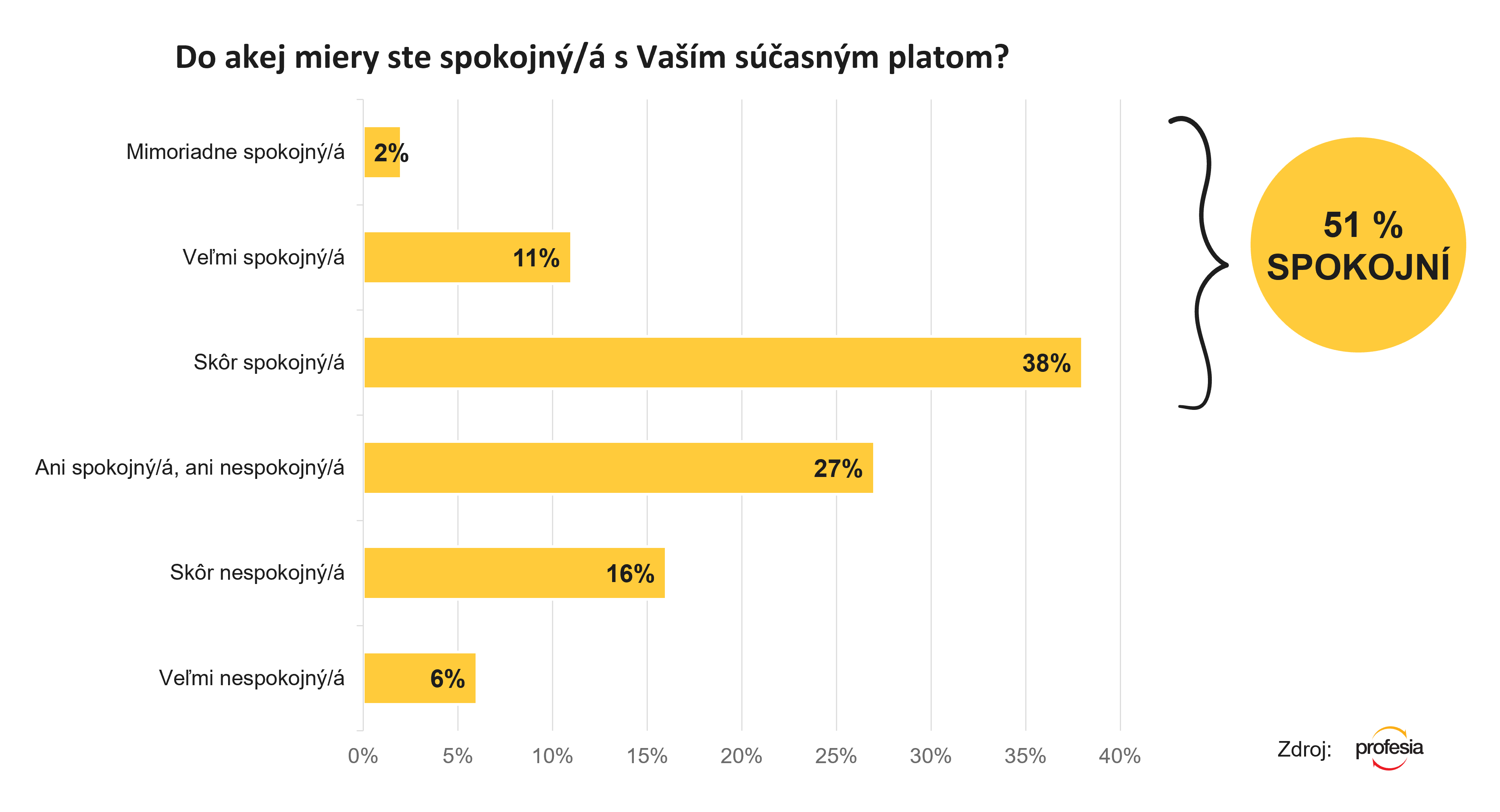 Výsledky prieskumu agentúry Focus pre portál Profesia.sk poukazujú na klesajúcu spokojnosť s platmi u ľudí pracujúcich na Slovensku. Zatiaľ čo v roku 2021 boli spokojné takmer dve tretiny a o 2 roky neskôr 58 percent, koncom minulého roka to už tvrdila len polovica. Je to najmenej, odkedy v roku 2018 spoločnosť začala v prieskume tento postoj zisťovať. Mimoriadnu spokojnosť so svojou mzdou vyjadrili len 2 percentá pracujúcich. Naopak, narástol podiel nespokojných, zo 16 percent na 22 percent.