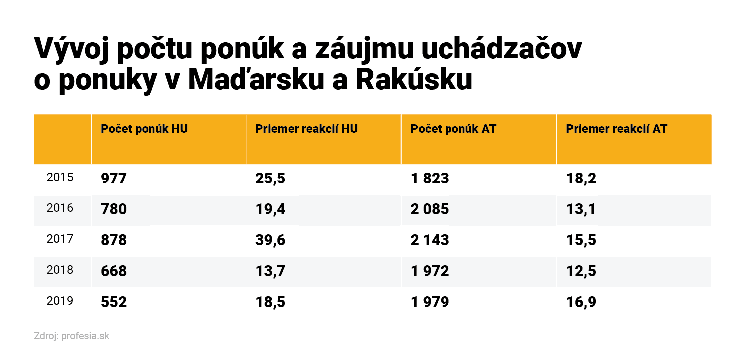 Kým priemerný počet reakcií na ponuky u našich západných susedov klesol, reakcie na Slovensku, naopak, rástli. V roku 2018 zareagovalo na inzerát necelých 15 uchádzačov, vlani išlo o viac ako 17 ľudí.