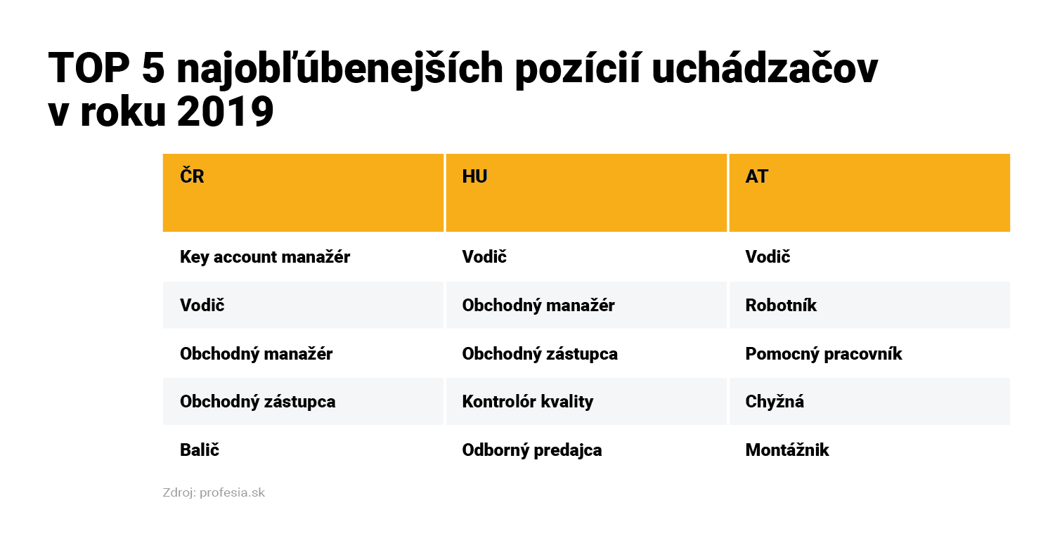 Uchádzači, ktorí sa v roku 2019 zaujímali o prácu v Českej republike alebo Maďarsku, reagovali najčastejšie na pozície v obchode. Popri obchodných manažéroch a zástupcoch išlo ešte o pozície vodičov a baličov.
