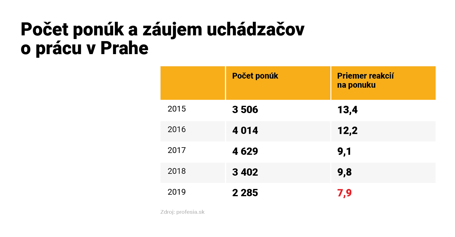 Stratu záujmu sledujeme aj pri pracovných inzerátoch v Prahe. V roku 2019 platilo, že na jednu ponuku v českej metropole zareagovalo takmer osem uchádzačov.
