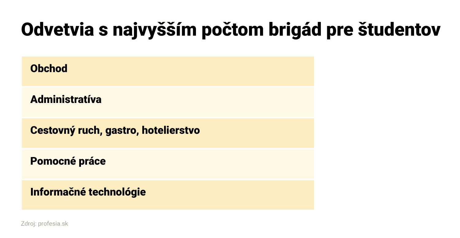 Zamestnávatelia ponúkajú študentom brigádu najčastejšie v obchode, administratíve a v cestovnom ruchu, gastre a hotelierstve. Najčastejšie ide o pracovné miesta predavač/ka, administratívny/a pracovník/čka, pokladník/čka a čašník/čka.