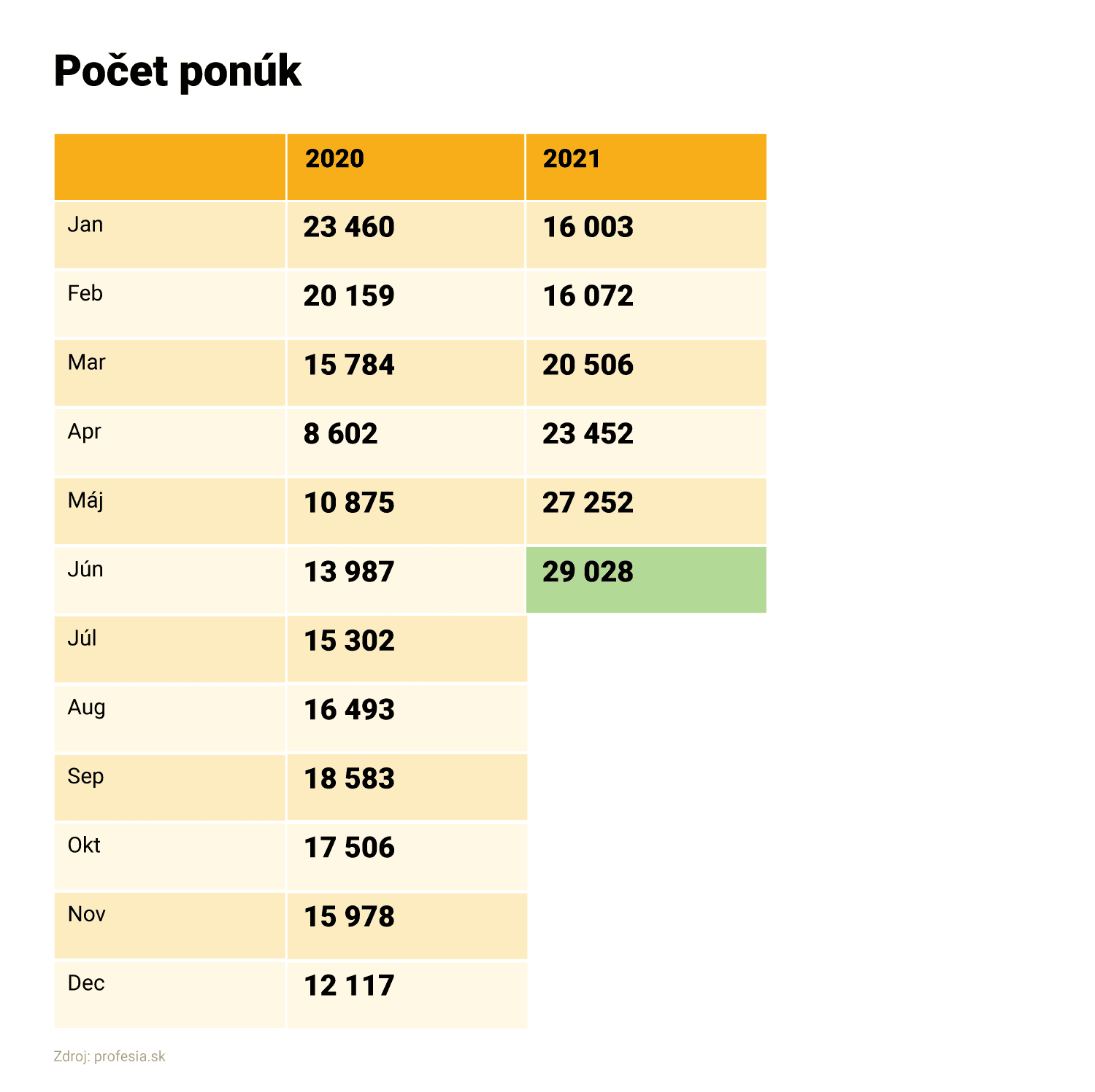 Uplynulé obdobie zaznamenal najväčší portál na Slovensku hneď dva rekordy za sebou. Rekordný počet ponúk uverejnili zamestnávatelia na Profesia.sk najskôr v máji. Historicky najvyšší počet inzerátov však nevydržal dlho. Rekord bol prekonaný opäť v júni.