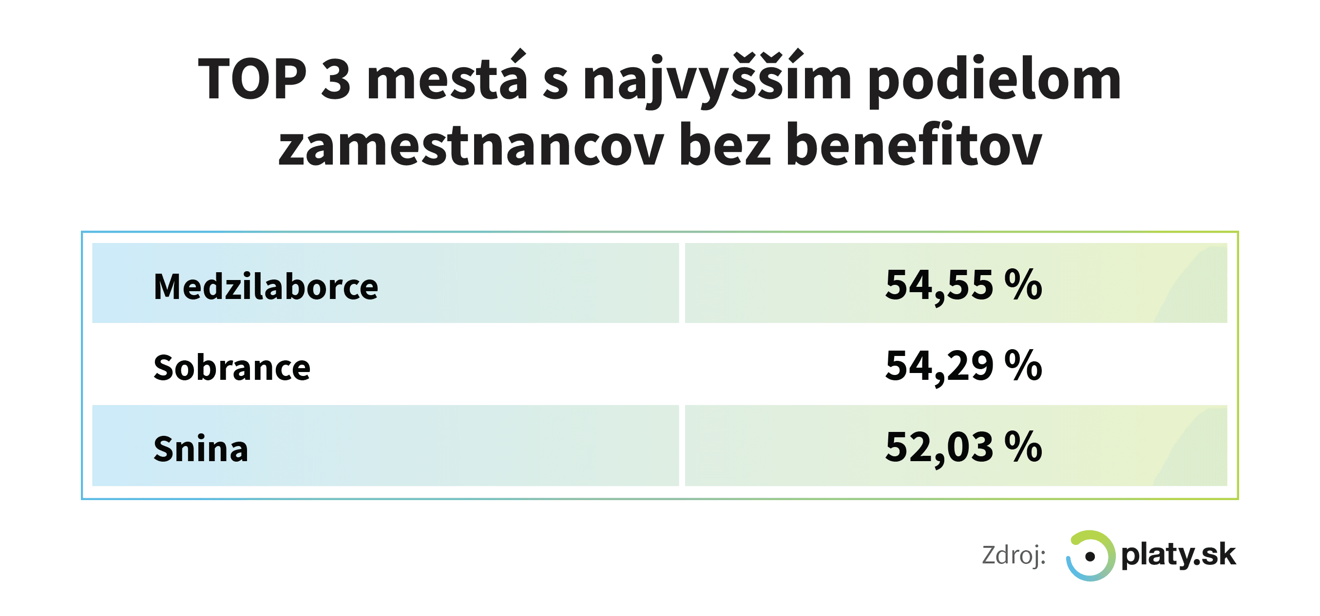 Úplne iná situácia je napríklad v Medzilaborciach. Štatistiky ukazujú, že ide o okres, v ktorom sú benefity najmenej rozšírené. Ukazuje sa, že väčšina zamestnancov tu žiadne nefinančné benefity nemá.
