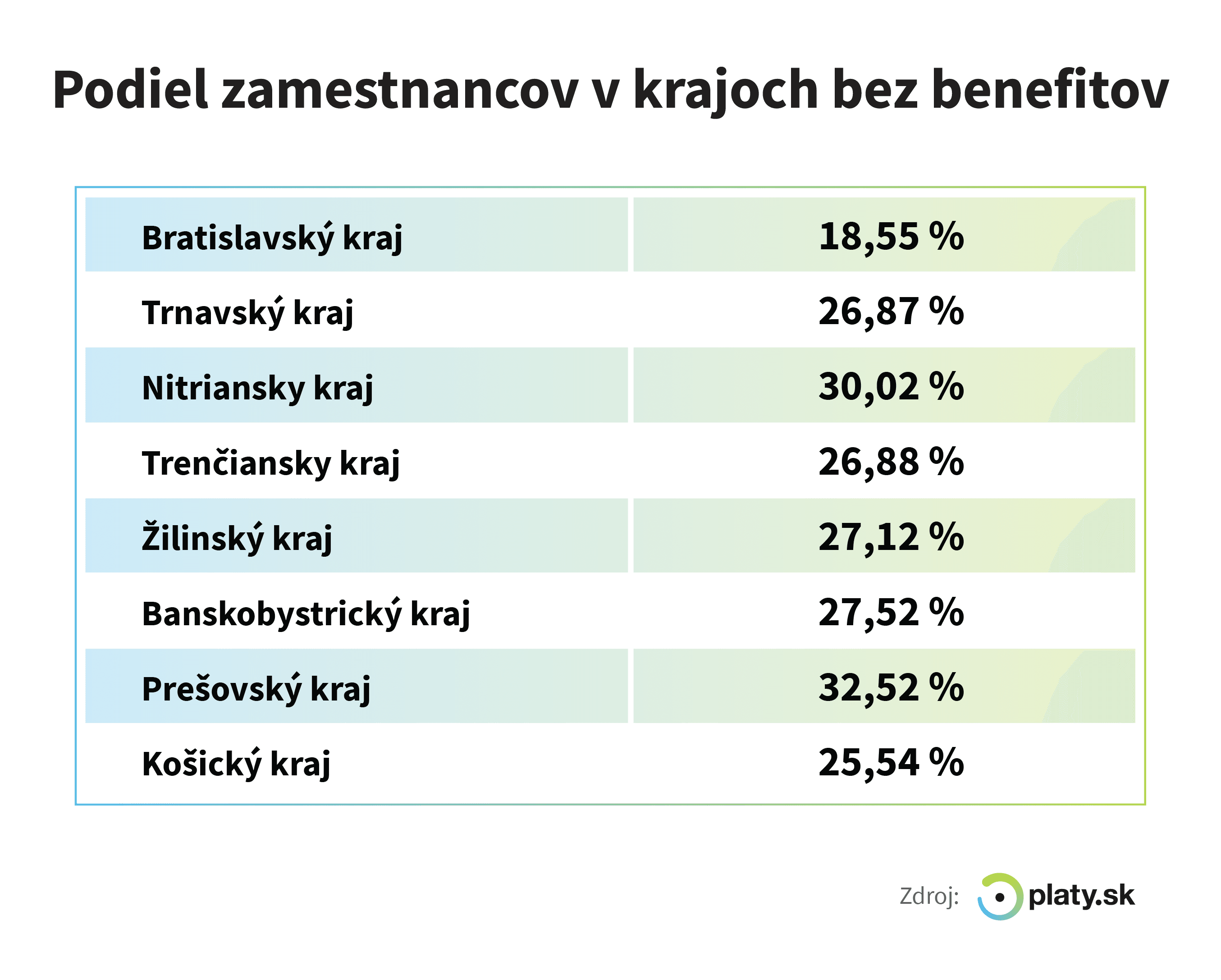 Zamestnanecké benefity sú najviac rozšírené v hlavnom meste. V Bratislave a okolí je podľa našich štatistík iba 18,55 percenta zamestnancov, ktorí nemajú k dispozícii žiadne výhody. Na druhom konci je Prešovský kraj. V tomto regióne je takmer tretina pracovníkov, ktorí vo svojom zamestnaní nemajú spomínané plusy.