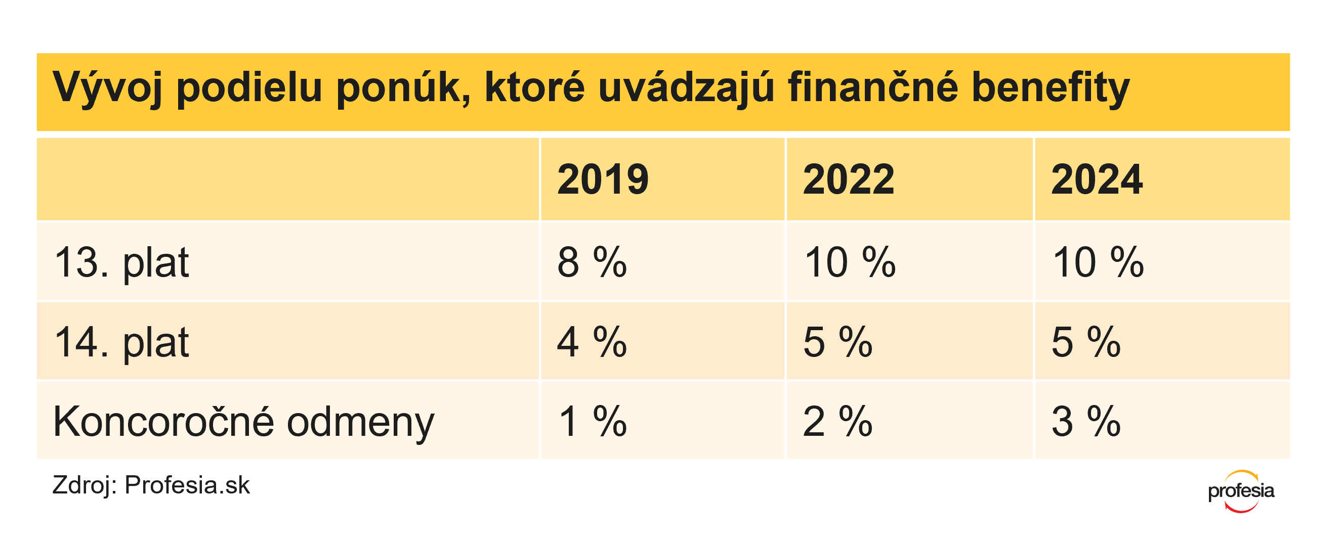 Podiel ponúk, ktoré uvádzajú finančné benefity, postupne rastie. Zatiaľ čo v roku 2019 uvádzalo 13. plat 8 percent inzerátov na Profesia.sk, o 3 roky to už bolo 10 percent, pri 14. plate portál eviduje nárast o 1 percento. Z hľadiska nárastu podielu zo všetkých ponúk vidno najväčší progres v prípade koncoročných odmien. V roku 2019 ich spomínalo len percento inzerátov, v roku 2022 2 percentá a tento rok 3.