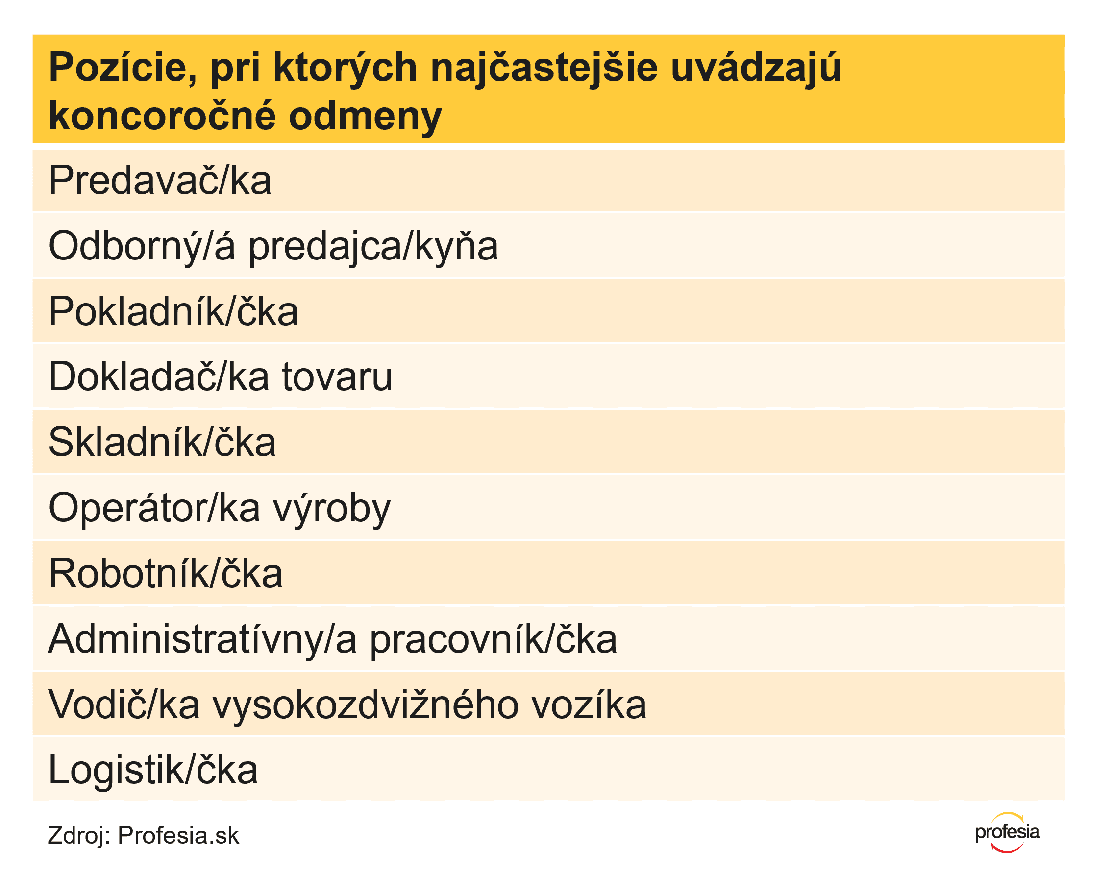 Takmer štvrtina z týchto inzerátov bola z maloobchodu, aj preto sú pozície, ktoré si najčastejšie užijú koncoročné odmeny, iné ako v prípade predchádzajúcich benefitov. Na koncoročné prémie sa môžu tešiť predavači a predavačky, odborní predajcovia, pokladníci, dokladači tovaru či skladníci.