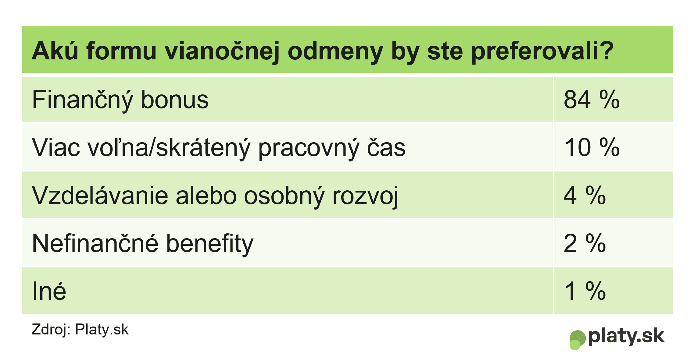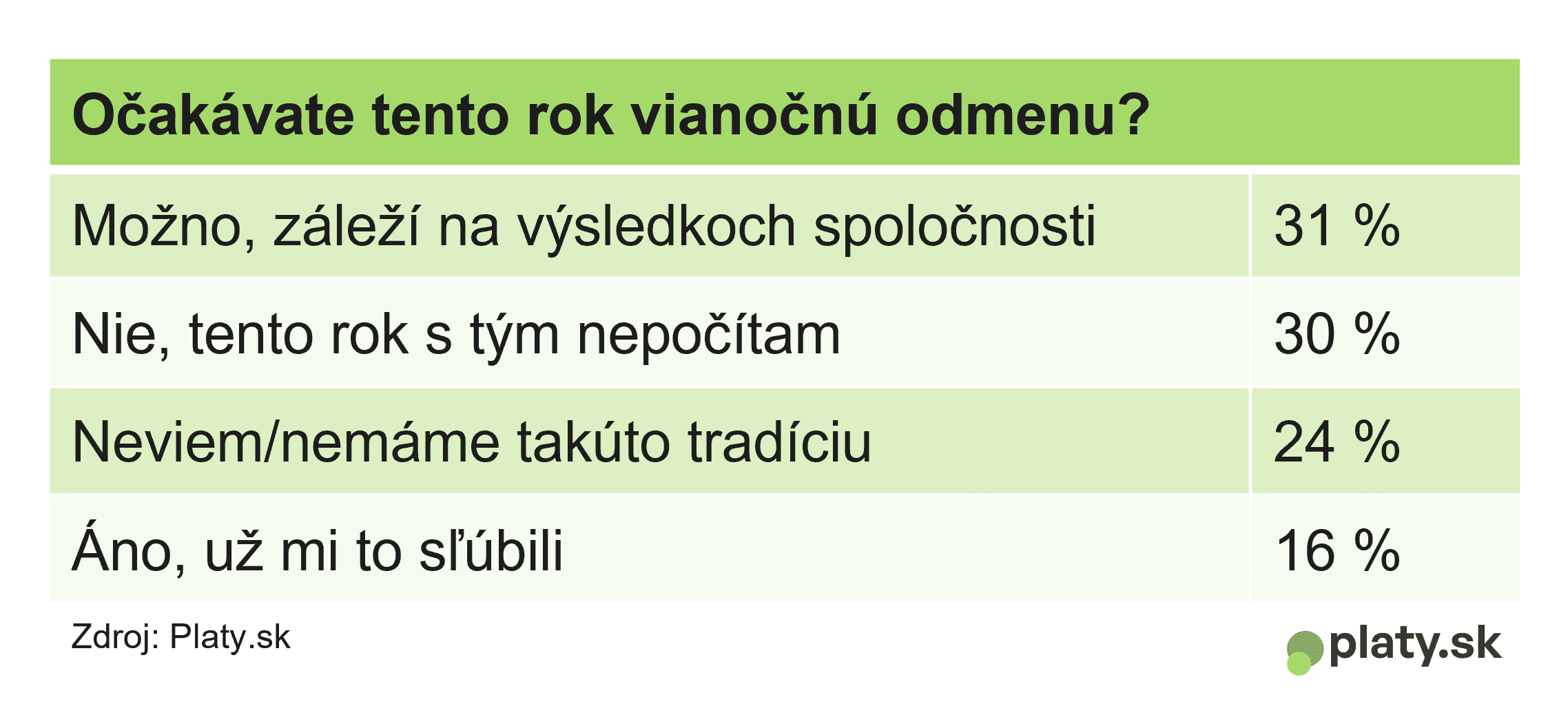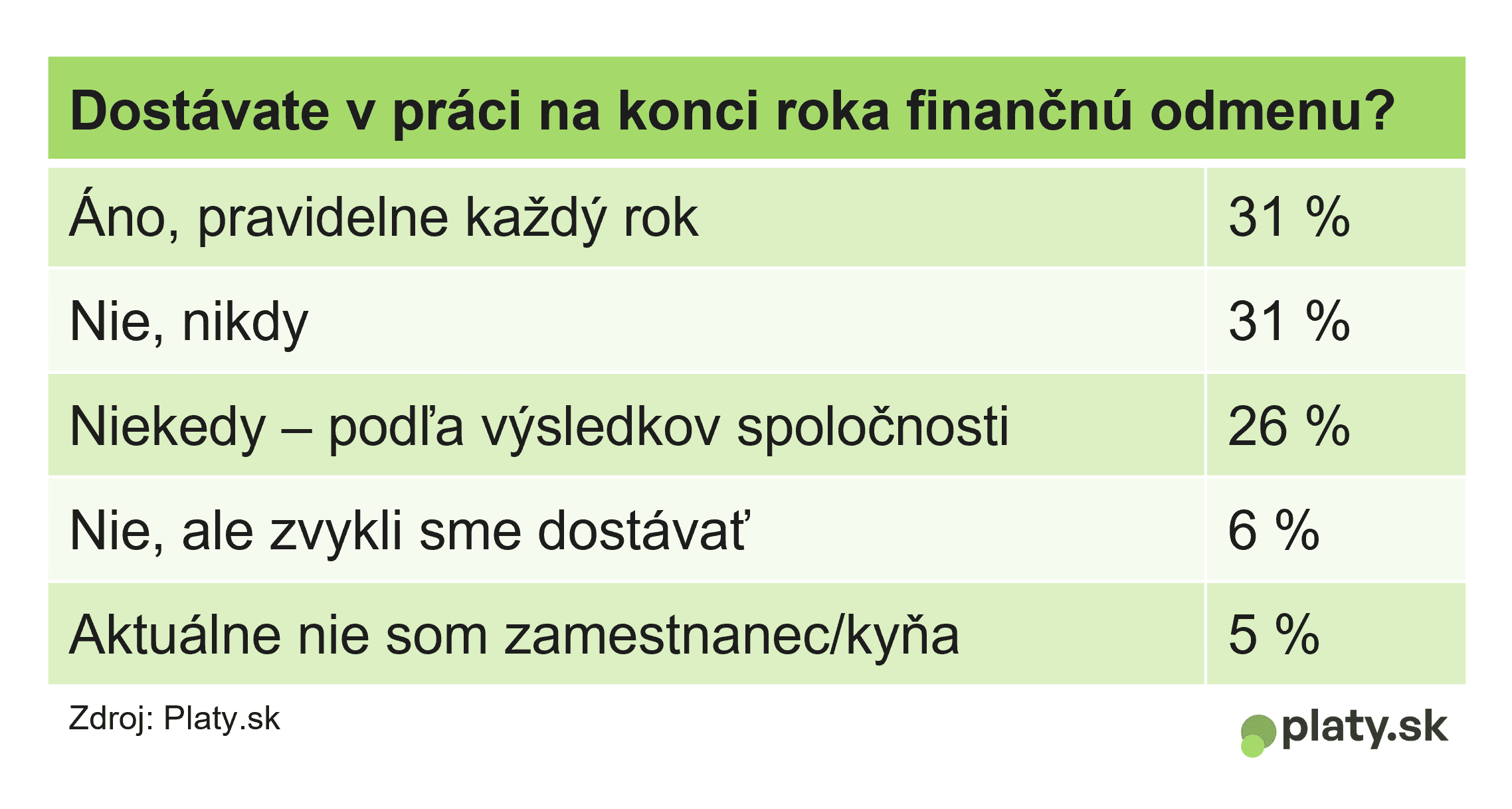 Pravidelné finančné odmeny na konci roka dostáva len necelá tretina zamestnankýň a zamestnancov na Slovensku, či už vo forme výkonnostných bonusov, prémií alebo 13. a 14. platu. Ďalšia štvrtina ich dostáva podľa výsledkov spoločnosti, v ktorej pracujú. Vyplýva to z prieskumu portálu Platy.sk, ktorý sa realizoval na prelome októbra a novembra tohto roka na vzorke 1 533 pracujúcich.