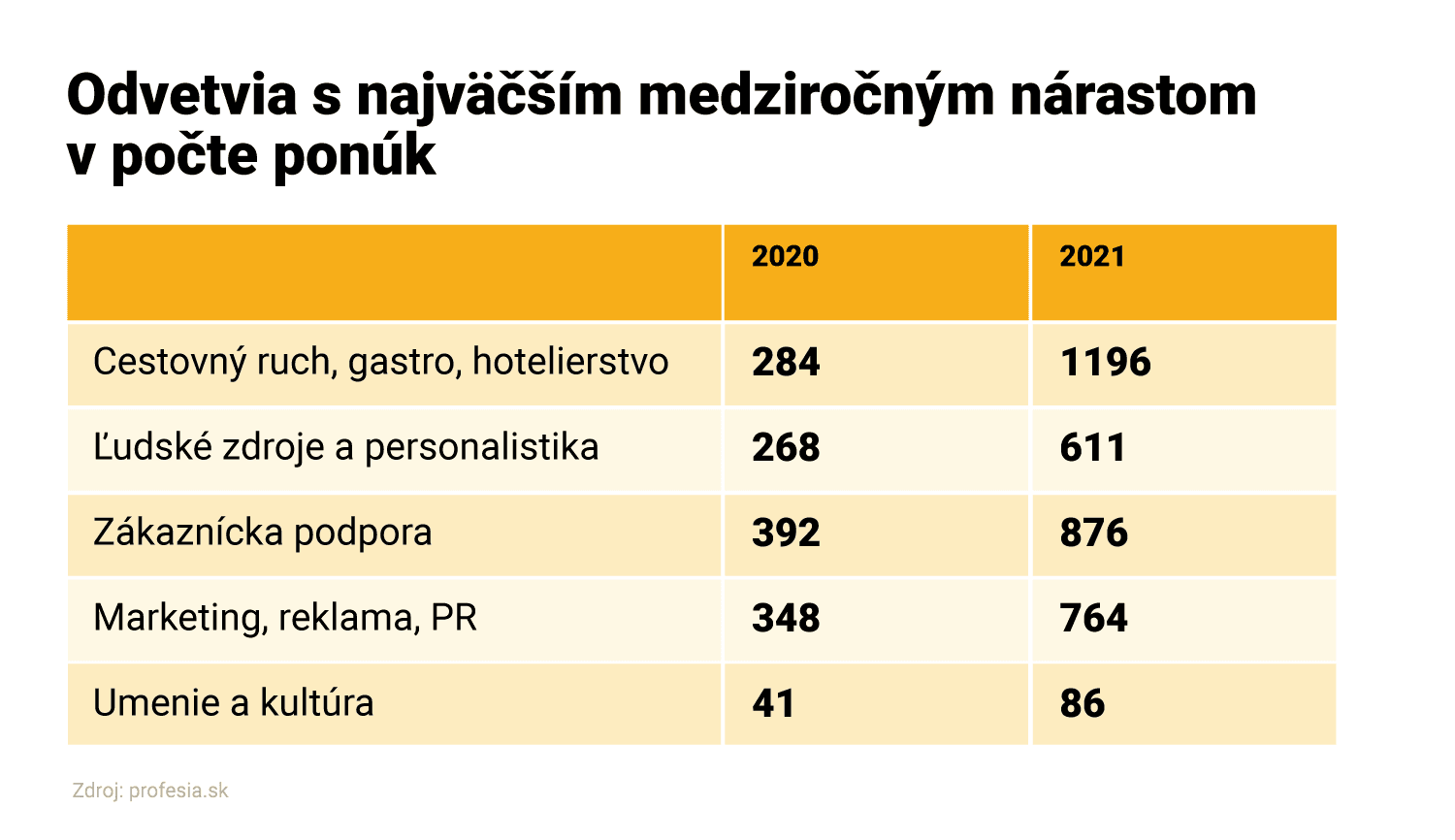 Cestovný ruch, gastro a hotelierstvo. Práve odvetvie, ktoré sa s pandémiou spomína azda najčastejšie, je tým, kde vidíme najväčší medziročný nárast v počte ponúk. Oproti roku 2020 stúpol počet inzerátov takmer štvornásobne. Najväčší medziročný nárast bol najmä pri pozíciách ako čašník/čka, barman/ka a kuchár/ka.