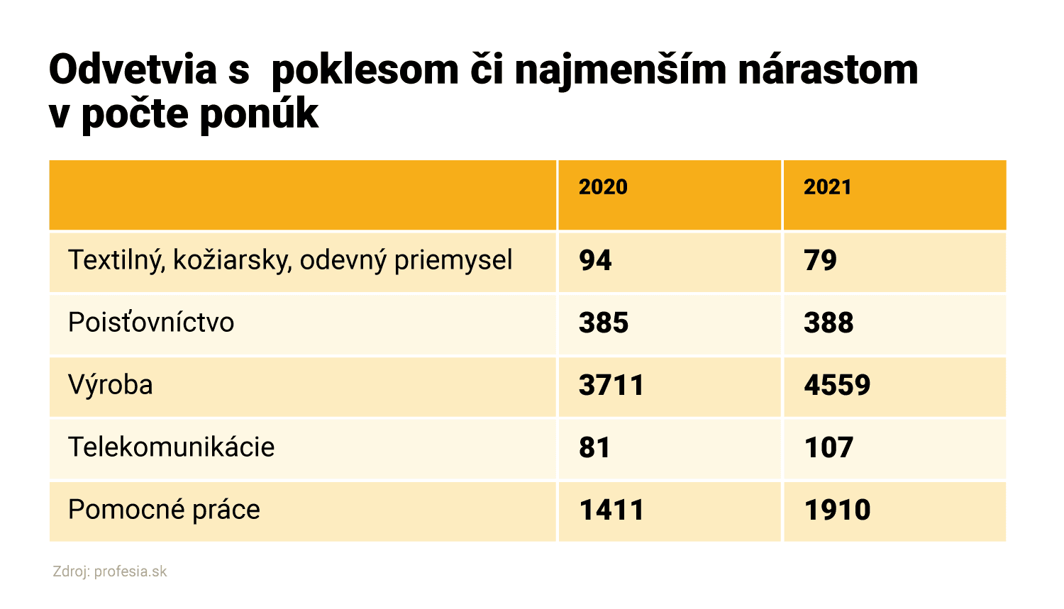 Jediným sektorom, kde portál Profesia.sk pozoruje medziročný pokles, je textilný, kožiarsky a odevný priemysel. Zamestnávatelia uverejnili v tomto októbri 79 ponúk. To je o 15 menej ako minulý rok.