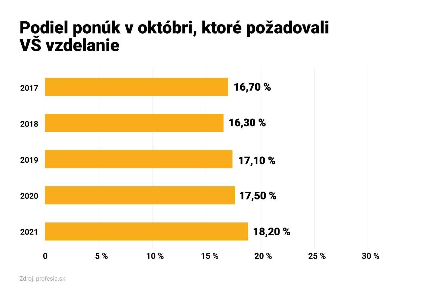 Porovnanie s predošlými rokmi prezrádza, že v ponuke práce sa čoraz častejšie objavujú požiadavky na vysokoškolské vzdelanie. V októbri tohto roka bola univerzita podmienkou v 18,2 percenta ponukách.