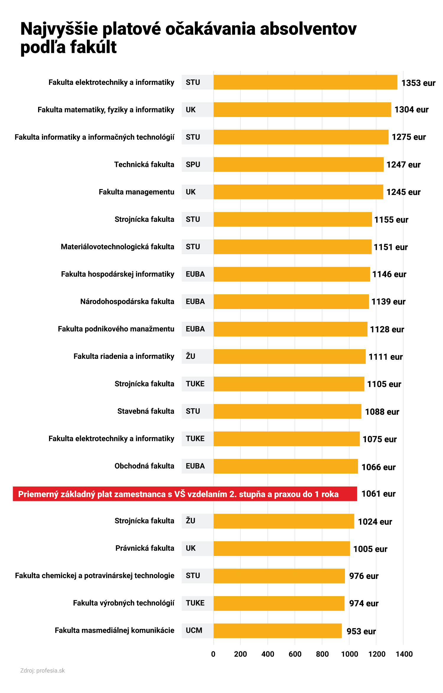 Podľa portálu Platy.sk bol vlani priemerný základný plat absolventa vysokej školy vo veku od 24 do 25 rokov 1061 eur v hrubom. Pracovný portál Profesia.sk pritom zaznamenal vyššie mzdové očakávania rovno na 15 verejných fakultách.