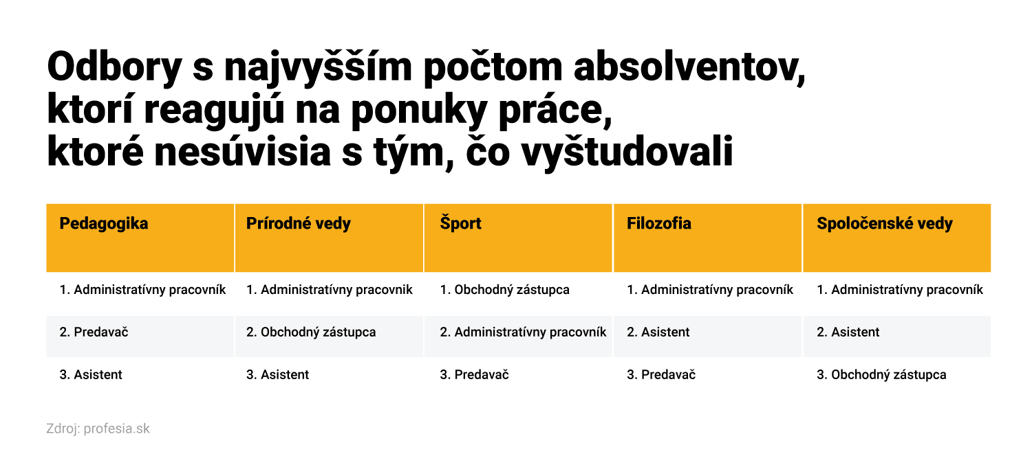 Ešte horšia je situácia pri absolventoch pedagogiky, ktorí si na pracovnom portáli Profesia.sk hľadali prácu najčastejšie taktiež na pozícií administratívneho pracovníka. Prvá pozícia, ktorá súvisí s ich odborom, bola v rebríčku až na 36. mieste a išlo o učiteľa materskej školy.