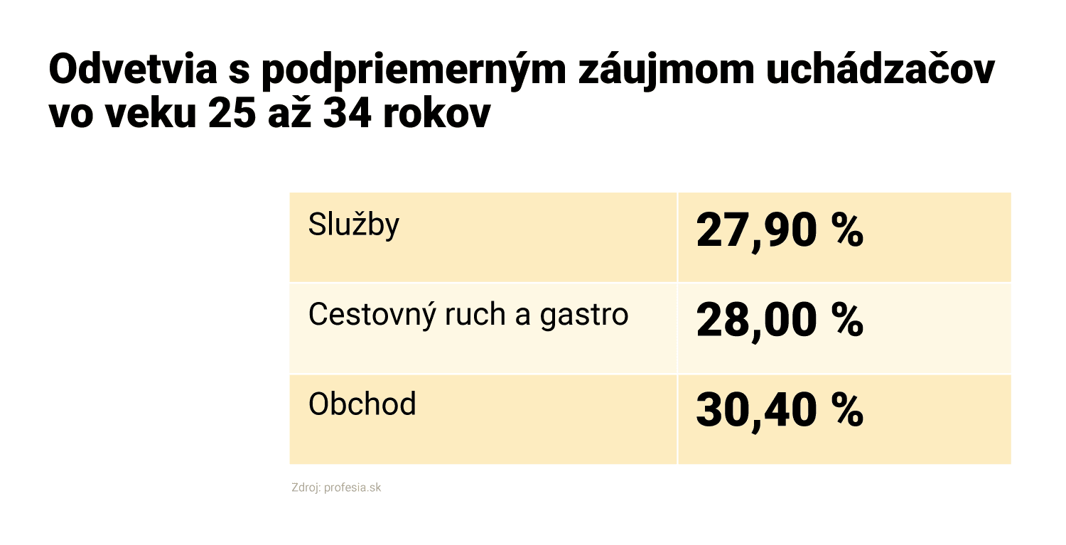 Pri veku 25 až 34 rokov vidíme najnižší podiel v službách, cestovnom ruchu a gastre či obchode. Naopak, najvyšší podiel vidíme v odvetviach ako bankovníctvo, poisťovníctvo či ekonomika a účtovníctvo.