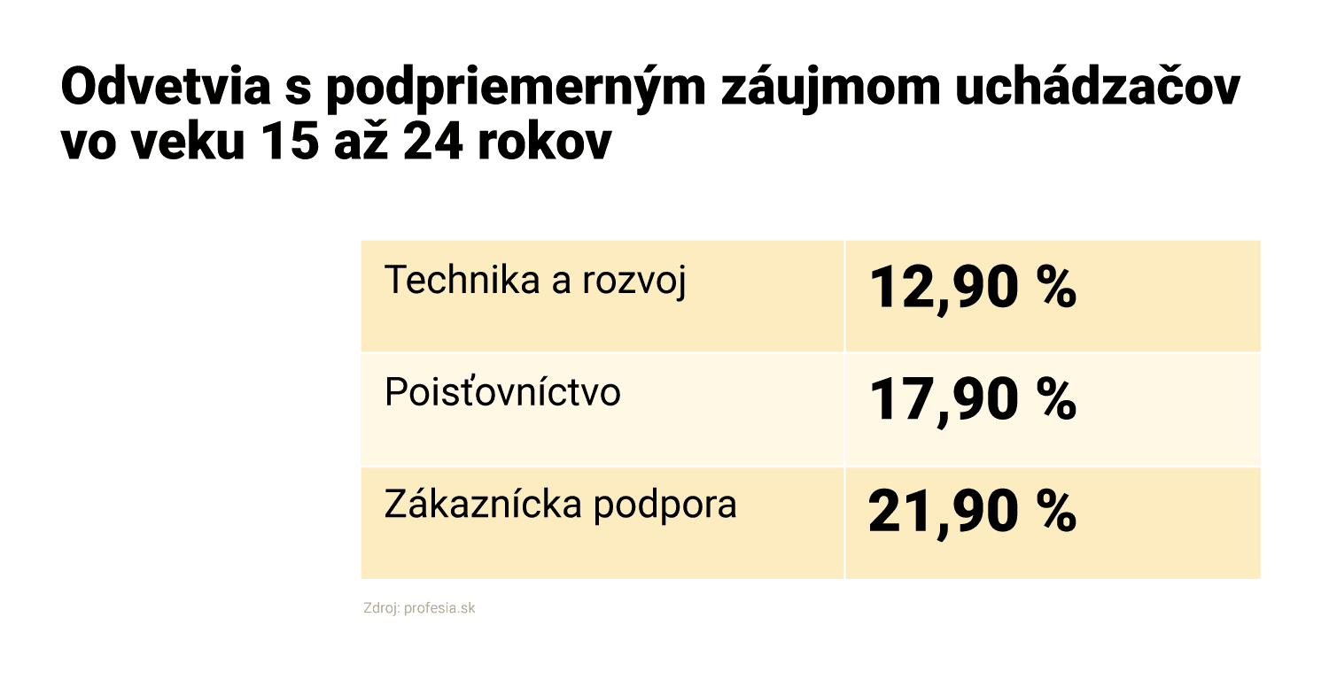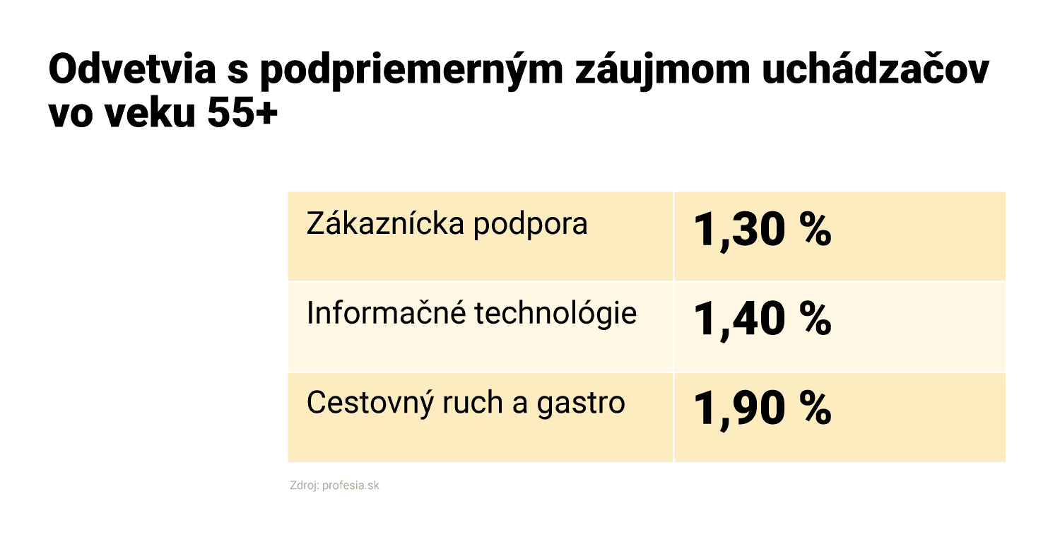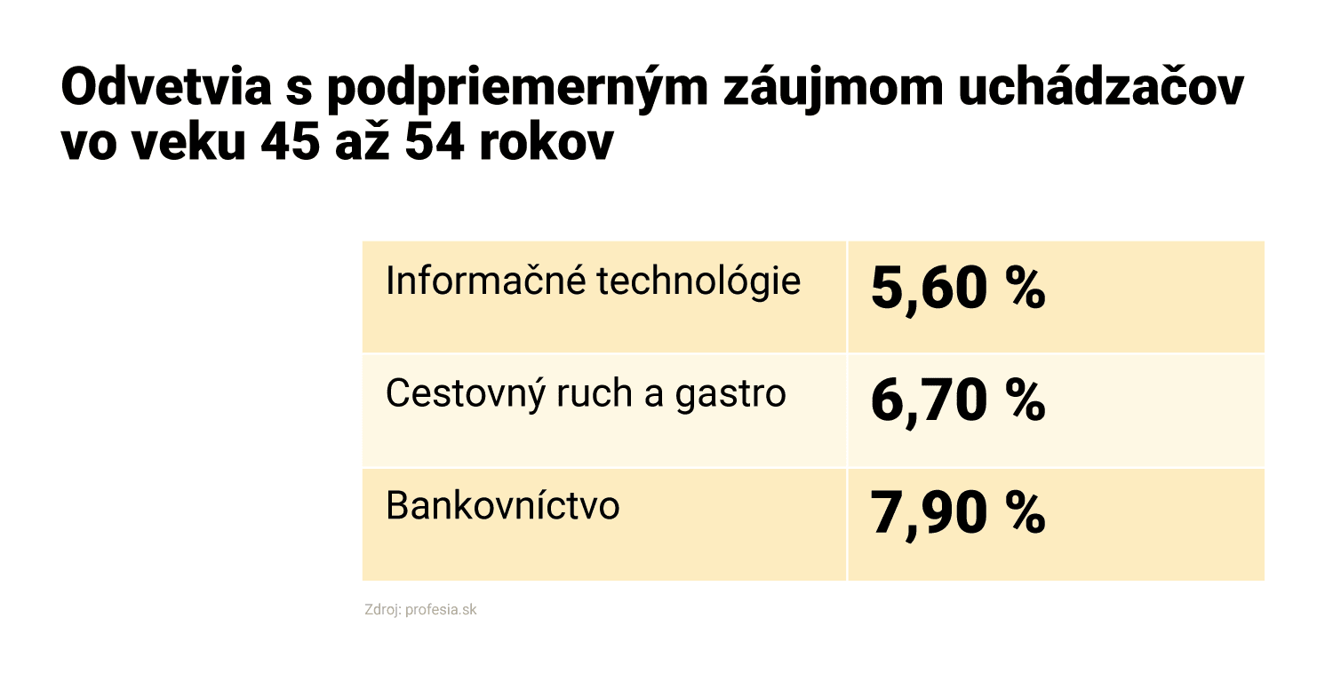 Spomedzi 15 odvetví nájdeme najnižší podiel uchádzačov tejto vekovej skupiny v poisťovníctve, zákazníckej podpore a v bankovníctve. Naopak, najvyšší podiel vidíme v cestovnom ruchu a gastre, IT a v službách.