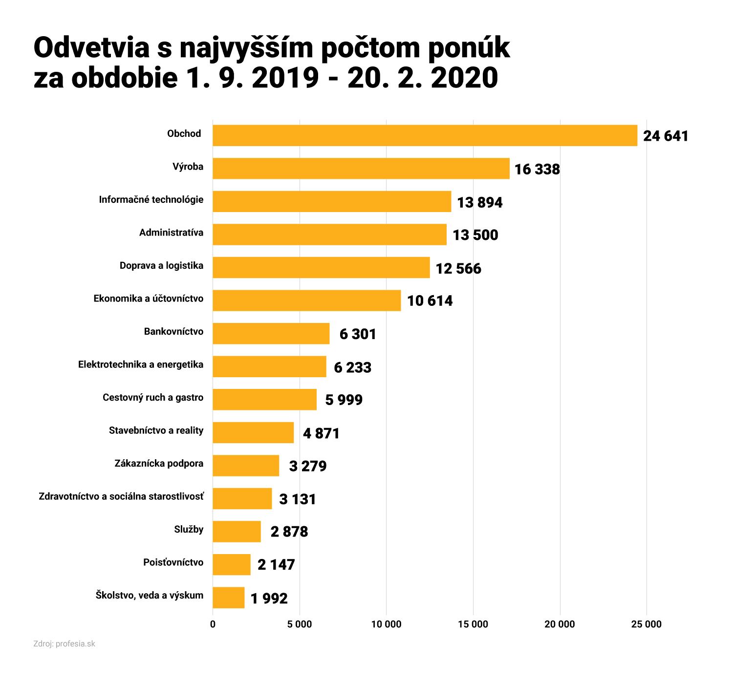 Obchod, výroba, IT, administratíva či doprava. Toto sú odvetvia, ktoré za posledný polrok priniesli na najväčší pracovný portál na Slovensku najviac pracovných ponúk. Portál Profesia.sk sa pozrel na to, kto je medzi TOP 15 odvetviami, ktoré od 1. septembra 2019 do 20. februára 2020 uverejnili najviac inzerátov.