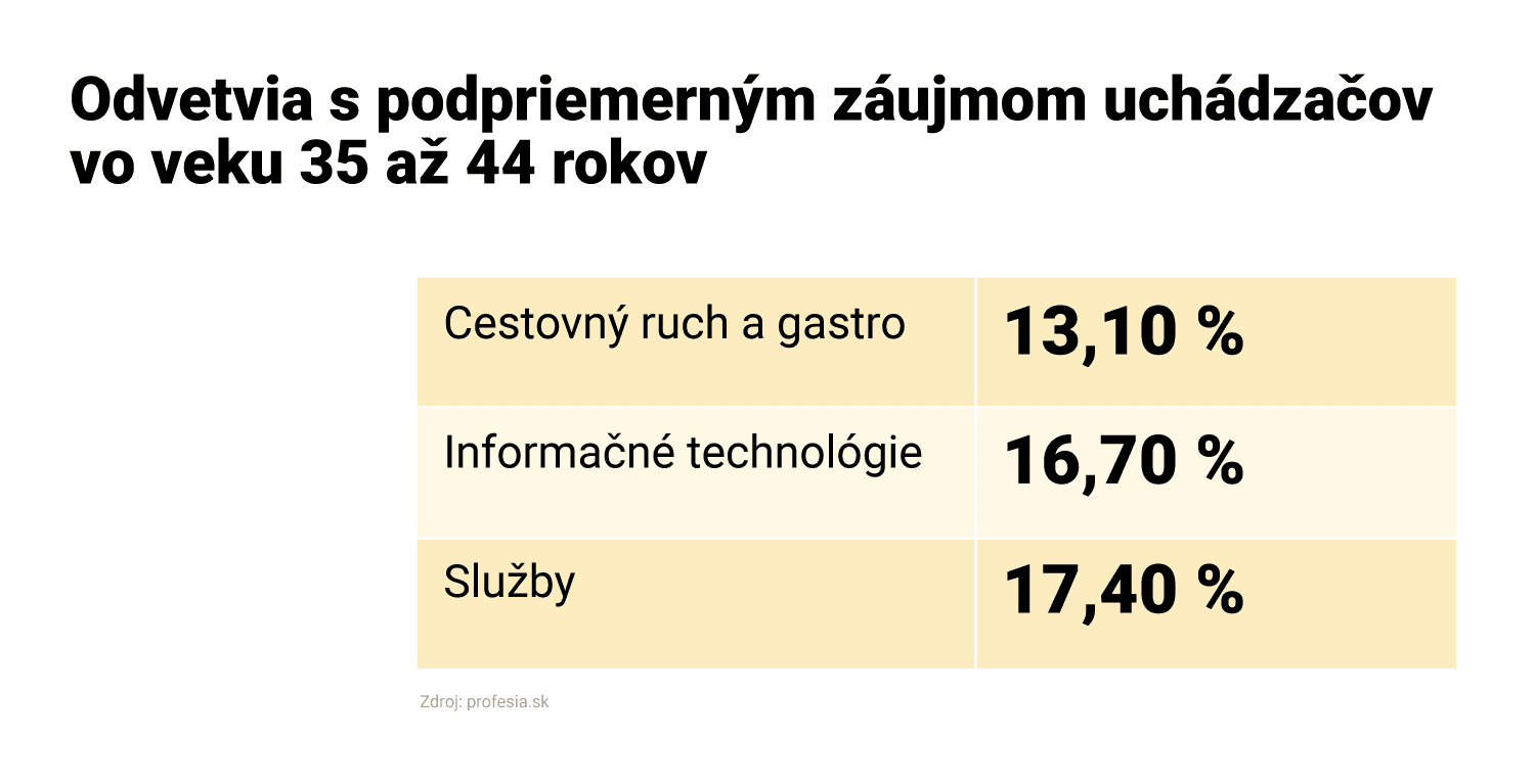 Odvetviami s najnižším záujmom uchádzačov vo veku od 35 do 44 rokov sú cestovný ruch a gastro, informačné technológie a služby. Najvyšší podiel tejto vekovej skupiny vidíme u uchádzačov zákazníckej podpory, poisťovníctva a výroby.