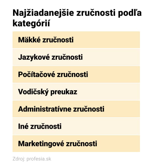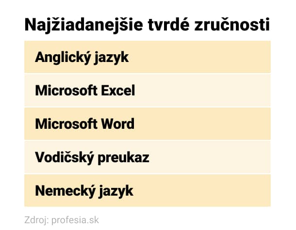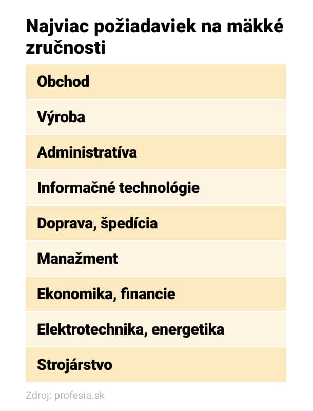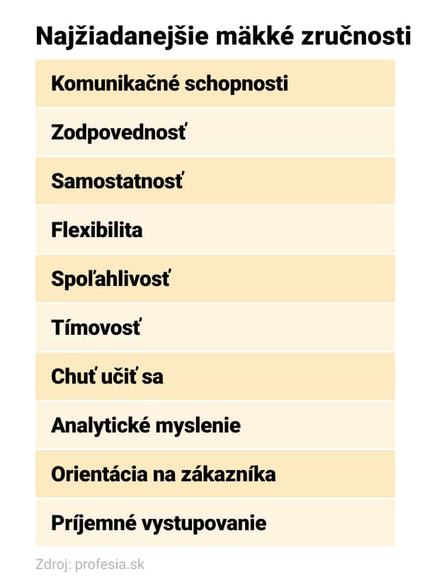 V roku 2013 bola v top 5 najžiadanejších zručností iba jedna mäkká – komunikačné schopnosti. V tohtoročných ponukách sa k nim pridala zodpovednosť a samostatnosť. Analýza dát portálu Profesia.sk ukázala, že medzi desiatimi najdôležitejšími schopnosťami z pohľadu zamestnávateľov je až šesť tzv. soft skills. Z odborných znalostí ostala v top 10 znalosť anglického jazyka, vlastnenie vodičského preukazu, práca s Wordom a Excelom.