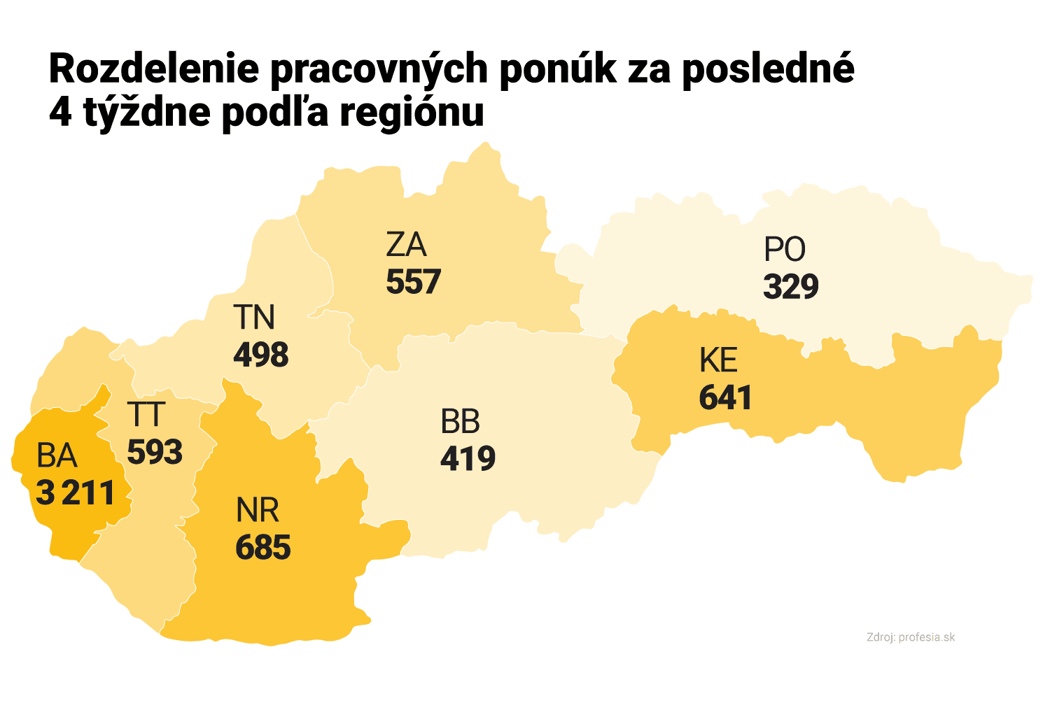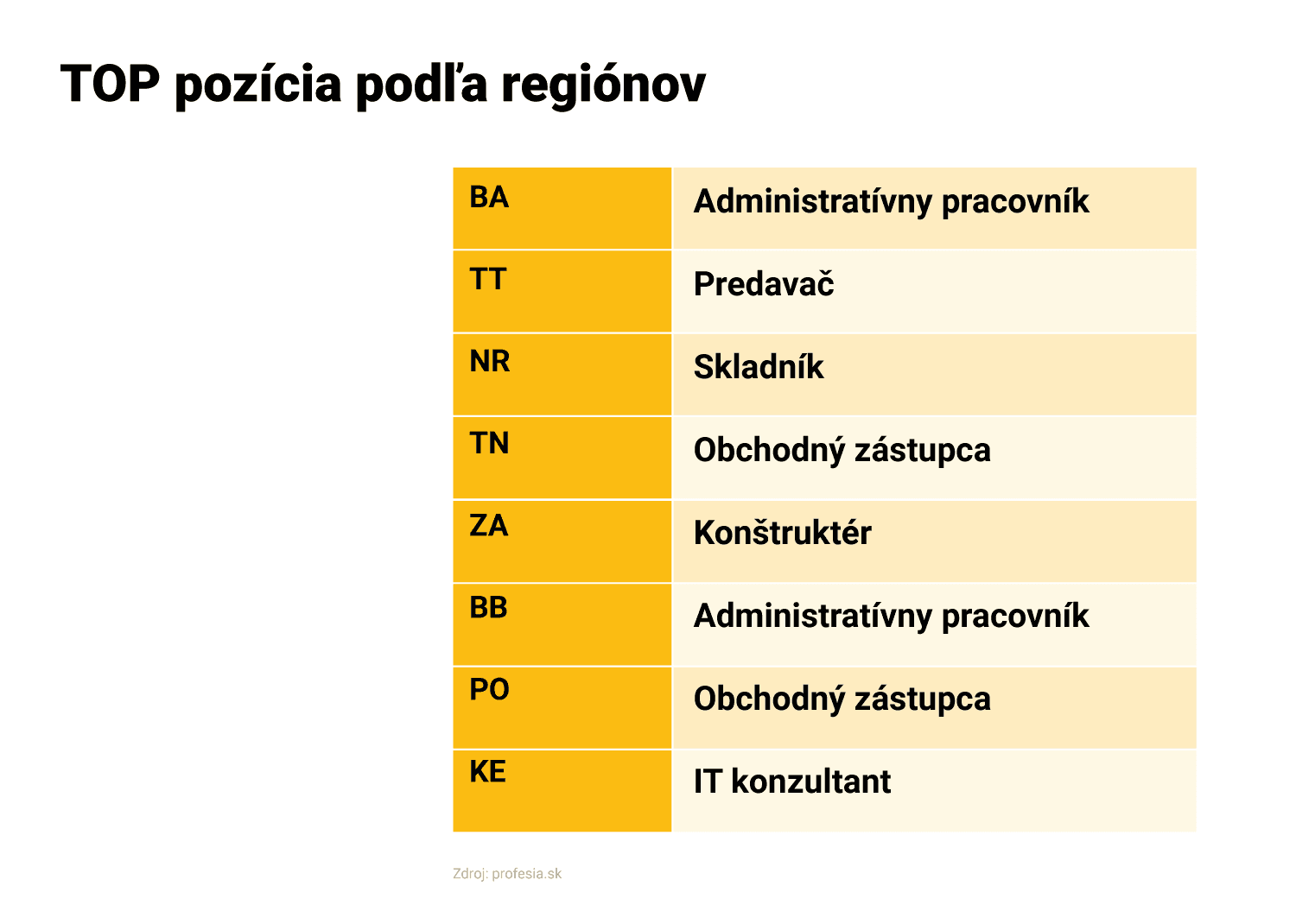 Čísla Profesie ukazujú, aký rozmanitý je trh práce v rôznych regiónoch. TOP pozícia, na ktorú hľadajú firmy najviac nových zamestnancov, je takmer v každom jednom regióne iná. Kým v Bratislavskom kraji je na prvom mieste jednoznačne administratívny pracovník, v trnavskom regióne je to predavač, v Nitre a okolí skladník.