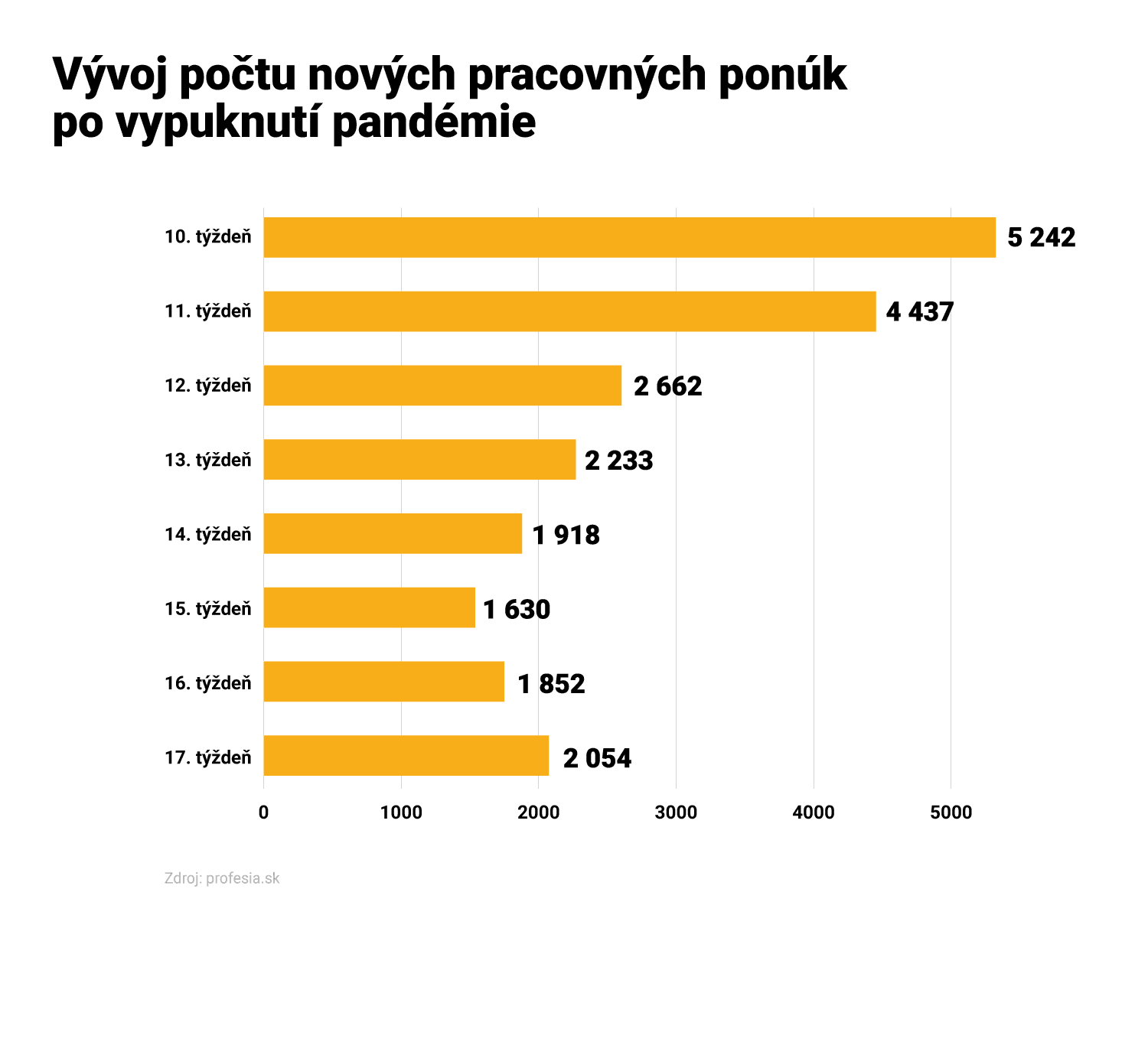 Spoločnosť Profesia uverejňuje novinky z trhu práce v súčasnej mimoriadnej situácii pravidelne. Sprístupnili sme COVID 19 Recruitment Report, ktorý je dostupný na covid.profesia.sk. Ide o týždenné údaje o počtoch nových pracovných ponúk na portáli Profesia.sk. Údaje sú aktualizované každý pondelok o ďalší ukončený týždeň. Ide o pomôcku, ktorá môže urýchliť tok informácií medzi našou spoločnosťou, zamestnávateľmi, médiami a mnohými ďalšími.