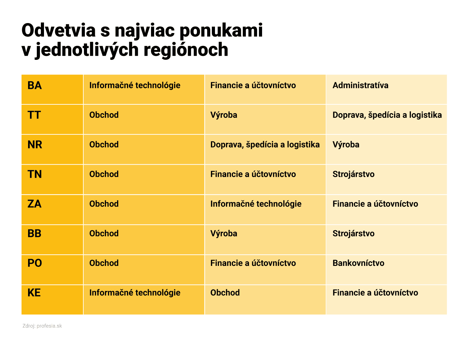V Trnavskom a Nitrianskom kraji vidíme tiež záujem o ľudí do výroby alebo dopravy, špedície a logistiky. V Trenčianskom či Banskobystrickom kraji sa medzi odvetviami s najviac ponukami nachádza tiež strojárstvo.