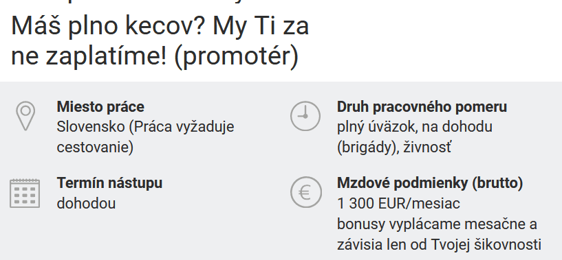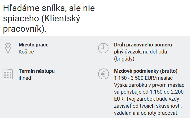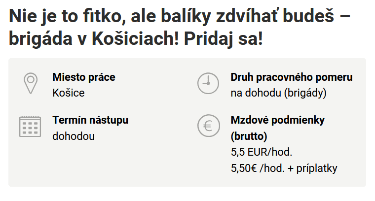 Brigádnické ponuky sú jedny z najatraktívnejších a zamestnávatelia sa na malý záujem zo strany uchádzačiek a uchádzačov, najmä v období pred letom či Vianocami, nemôžu sťažovať. V čase, keď sa stále viac Slovákov a Sloveniek stará o svoje zdravie a kondíciu sa firma, ktorá hľadala pracovníka/pracovníčku do skladu v Košiciach, rozhodla upútať práve tým, že hoci práca nie je cvičenie v posilňovni, aj dvíhaním balíkov sa dá nabrať svalová hmota.
