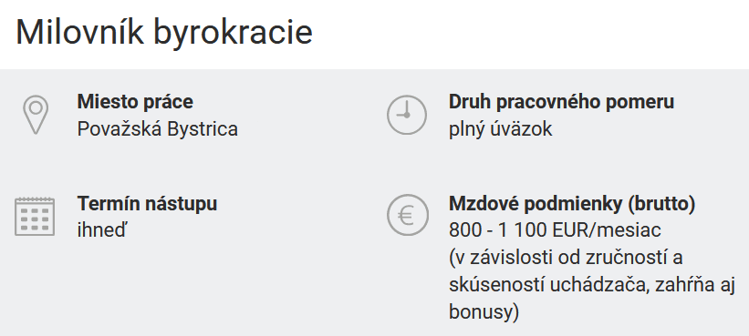 Na byrokraciu sa mnohí hnevajú a sú radi, ak jej majú v živote čo najmenej. No zamestnávateľ v Považskej Bystrici veril, že sa nájdu aj ľudia s opačným postojom. Takí, ktorí byrokraciu priam milujú. Ťažko povedať, či boli s takýmto odvážnym názvom atraktívni, no veríme, že svojho vysnívaného kandidáta či kandidátku našli.