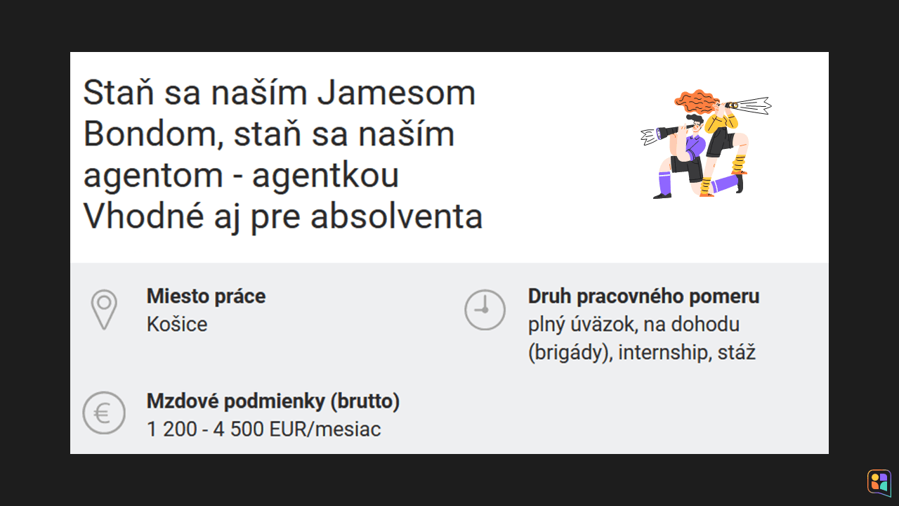 S tajnými agentmi sa tento rok roztrhlo vrece, trikrát ich hľadala aj Alma Career, prevádzkovateľ portálu Profesia.sk. Ich úlohou bolo poriadne preveriť vystavovateľov na Profesia days v Bratislave, Žiline a Košiciach, a získať čo najviac informácií o tom, čo firma zamestnancom ponúka.
