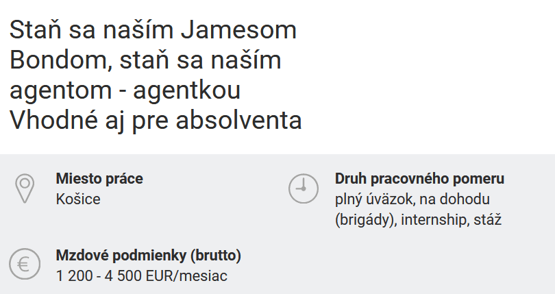 Vlani bol dopyt po Robinovi, tento rok zas po agentoch. Dlhoročná kvalifikácia však nebola potrebná, práca bola vhodná aj pre absolventov. Spoločnosť v Košiciach hľadala Jamesa Bonda a ide s dobou – bola otvorená aj ženám agentkám. Mzdové rozpätie bolo pomerne veľké, čiže aj taký borec ako James Bond sa musel snažiť, aby zarábal čo najviac.