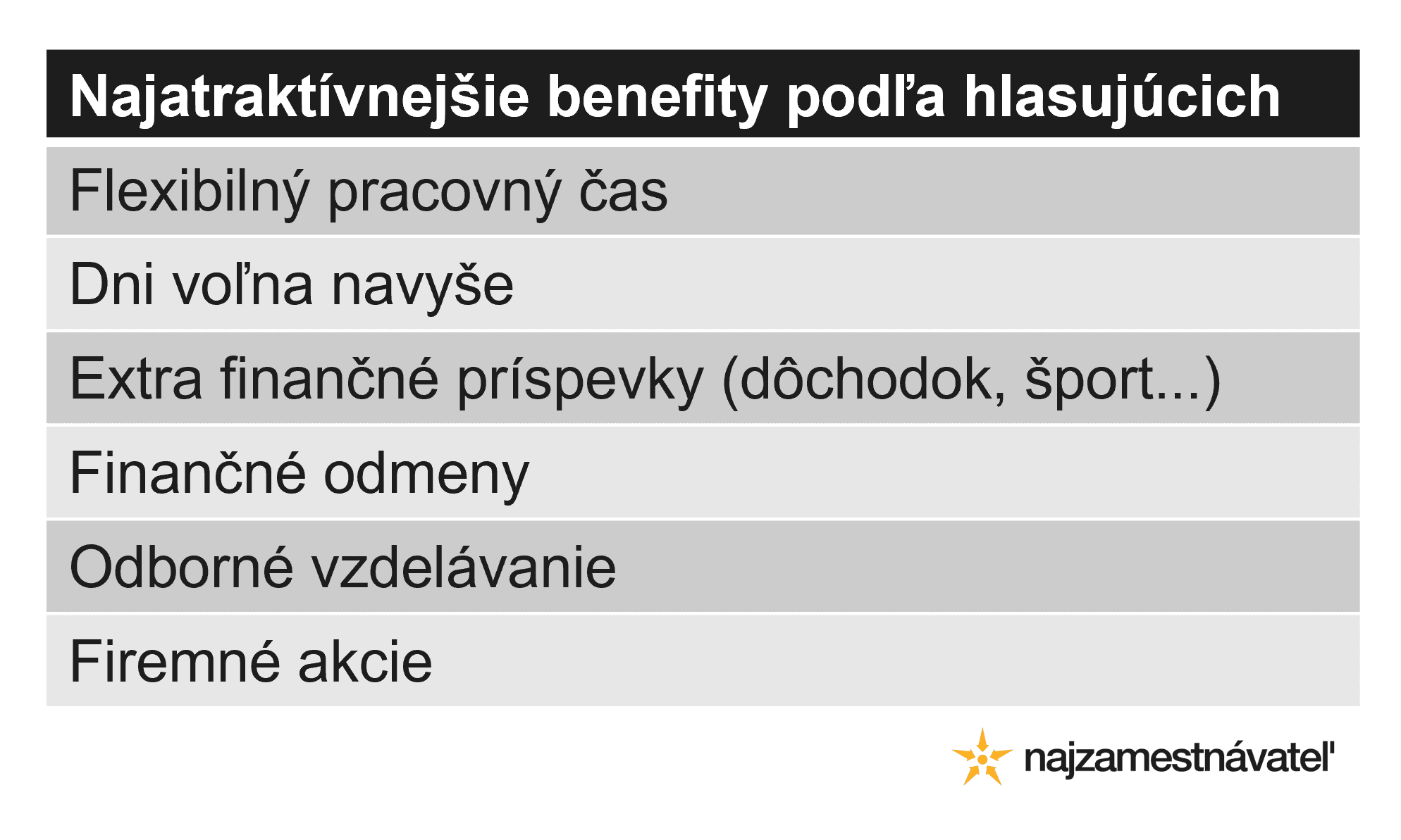 Hoci je pre zamestnancov stále najdôležitejším faktorom v práci plat, veľmi dôležité sú aj benefity. Hlasujúci ocenili najmä flexibilný pracovný čas, extra dni voľna a tiež finančné príspevky na šport, dôchodkové poistenie či cestovanie.