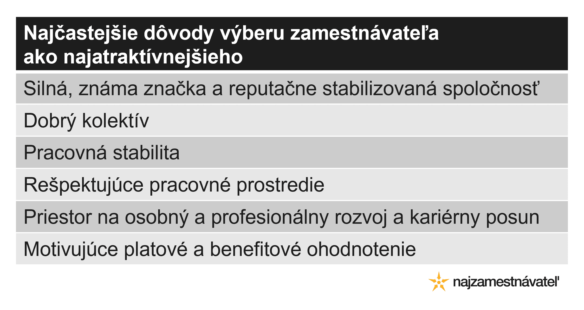 Najčastejší dôvod, pre ktorý hlasujúci a hlasujúce v ankete Najzamestnávateľ 2025 zvolili svojho favorita, bola silná, známa značka, ktorá je reputačne stabilizovaná. Veľmi dôležitý je tiež dobrý kolektív, pracovná stabilita a rešpektujúce pracovné prostredie.