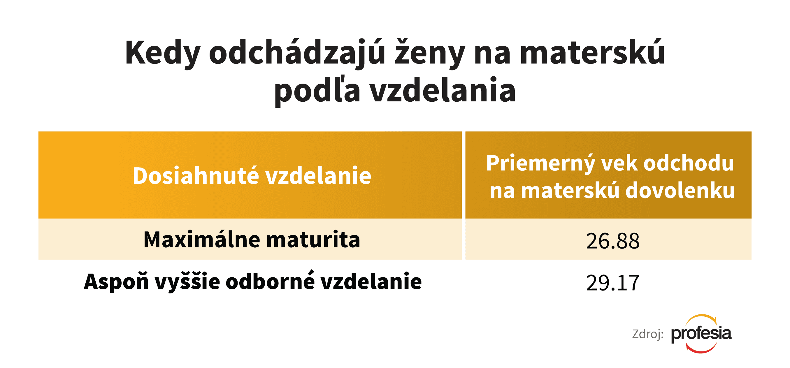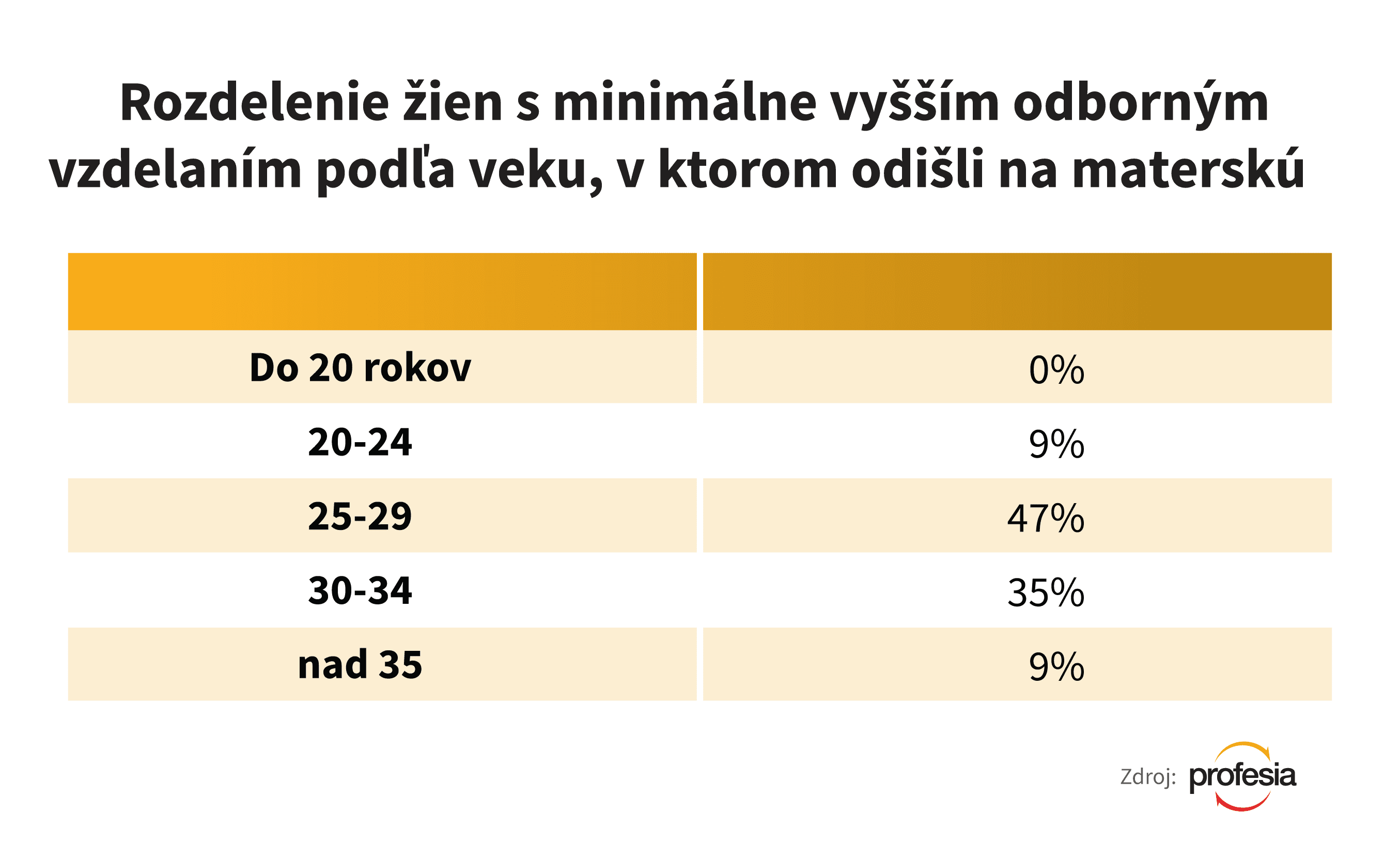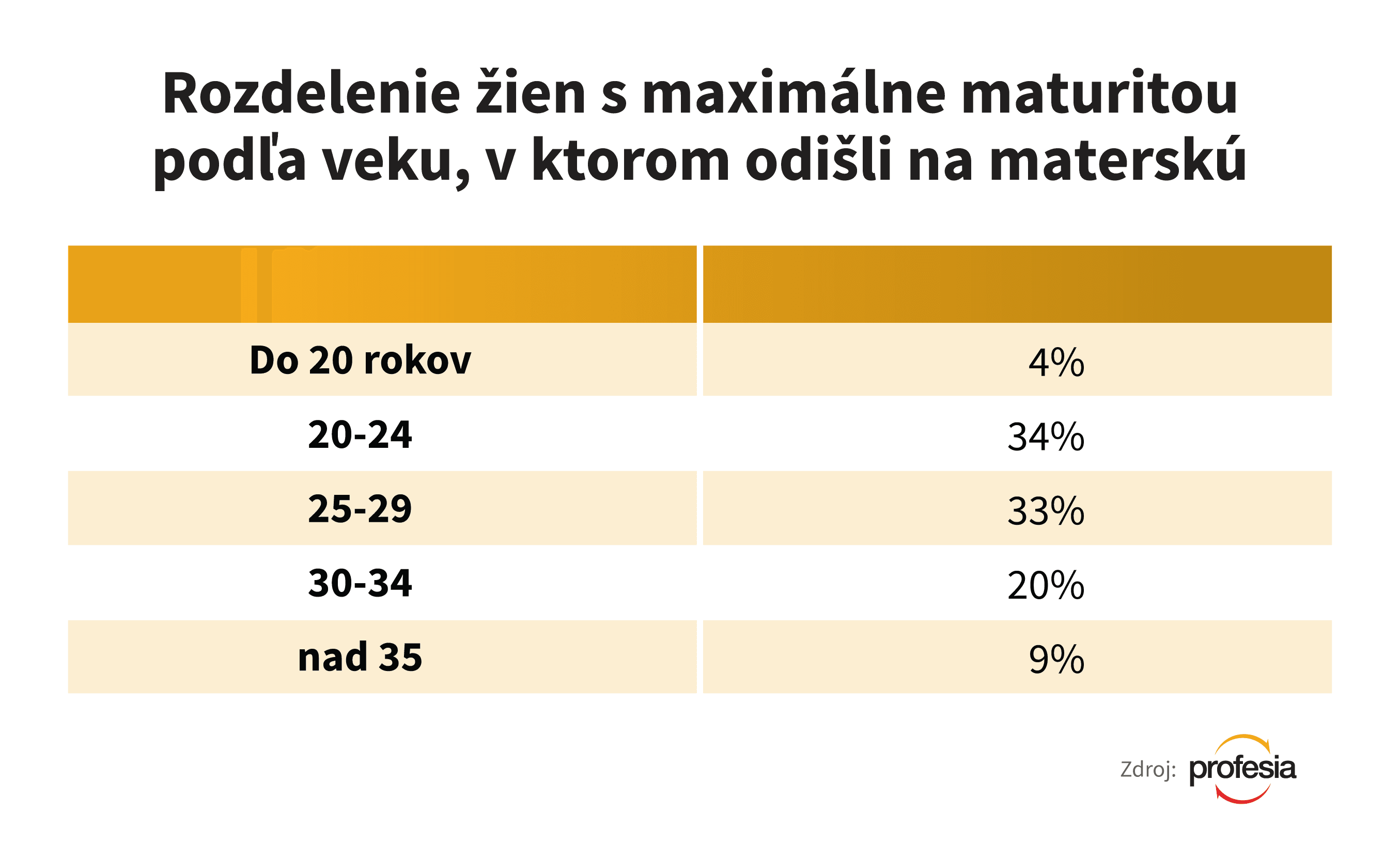 Skúsenosť s materstvom do 24 rokov má z databázy portálu Profesia.sk 44 percent žien, ktoré majú maximálne maturitu. Oproti nim je iba 9 percent žien, ktoré majú aspoň nadstavbu a mali dieťa do tohto veku.