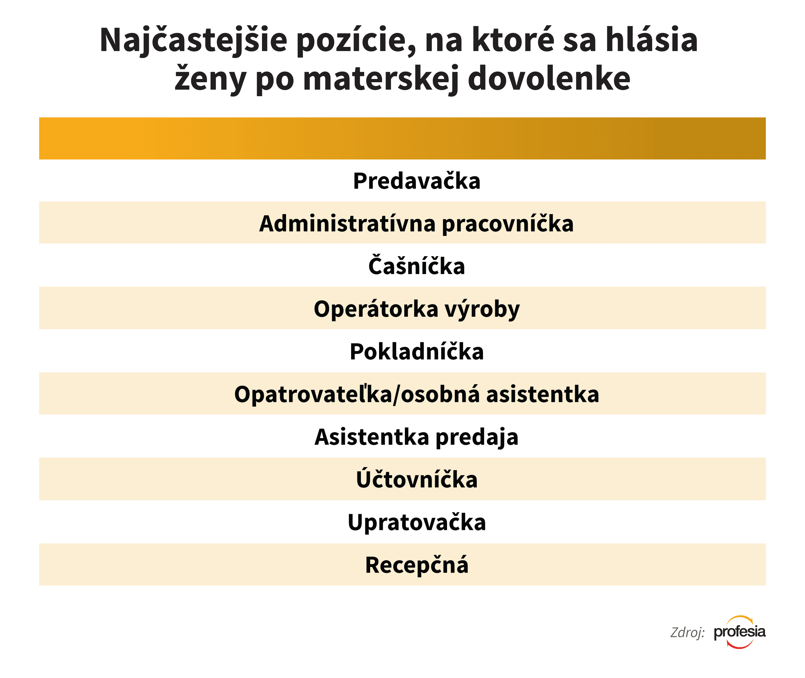 Predavačka, administratívna pracovníčka, čašníčka, či operátorka výroby. Toto sú najčastejšie pozície, na ktoré sa hlásia ženy po materskej dovolenke. V prvej desiatke sú najmä povolania, na ktoré stačí stredoškolské vzdelanie.