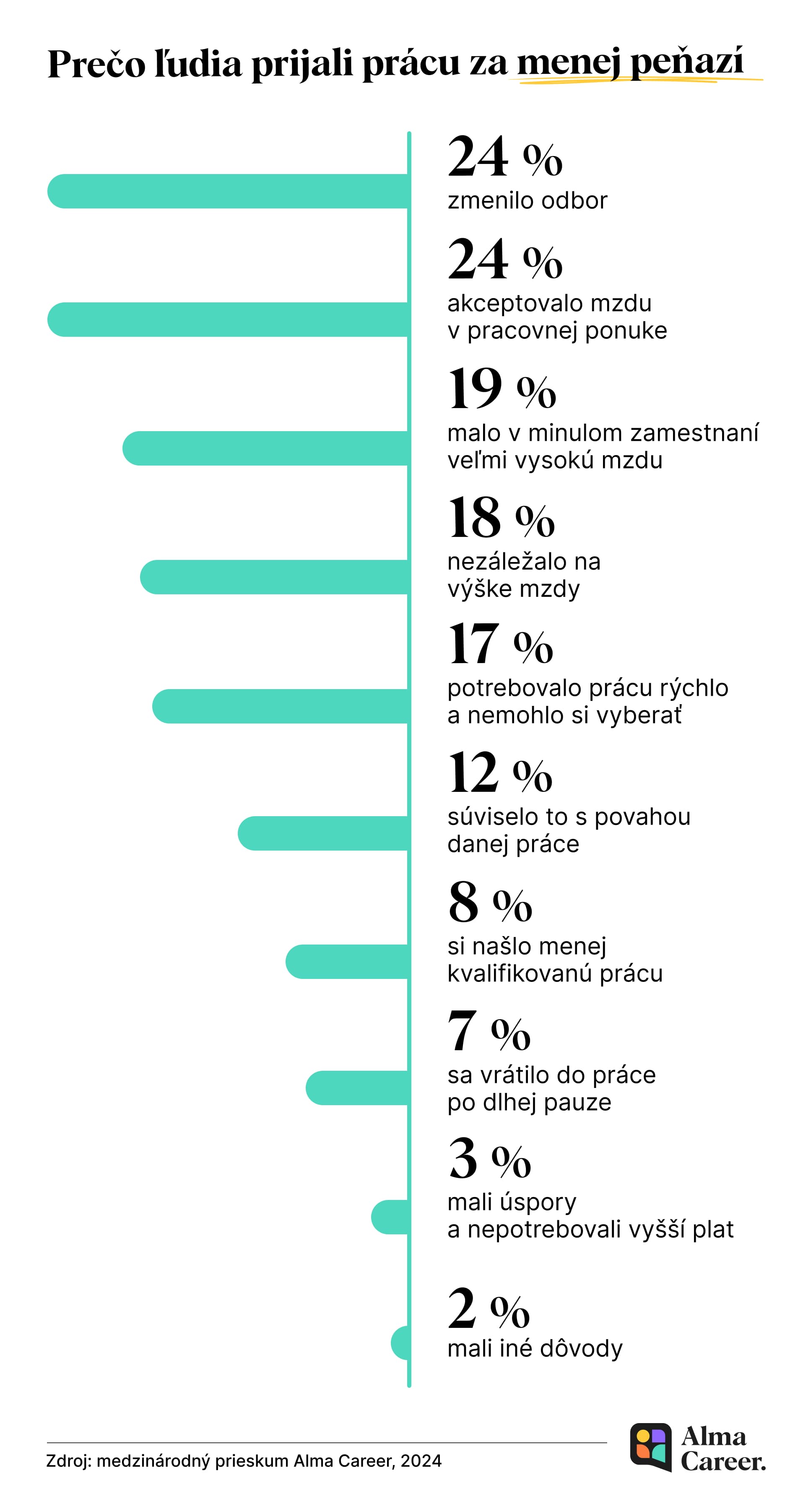 Dvoma hlavnými dôvodmi, prečo respondenti prijali horšie mzdové podmienky, boli zmena odboru, profesie alebo zamerania (24 %) a skutočnosť, že nižší plat bol uvedený v inzeráte (tiež 24 %). Pätina z tých, čo pristali na prácu za nižšiu mzdu, mala v predchádzajúcom zamestnaní pomerne vysoký plat, ktorý podľa nich nebolo reálne očakávať na novom mieste. Takmer pätina respondentov priznala, že im na výške mzdy nezáležalo, ďalší potrebovali prácu najmä rýchlo a nekládli si podmienky.