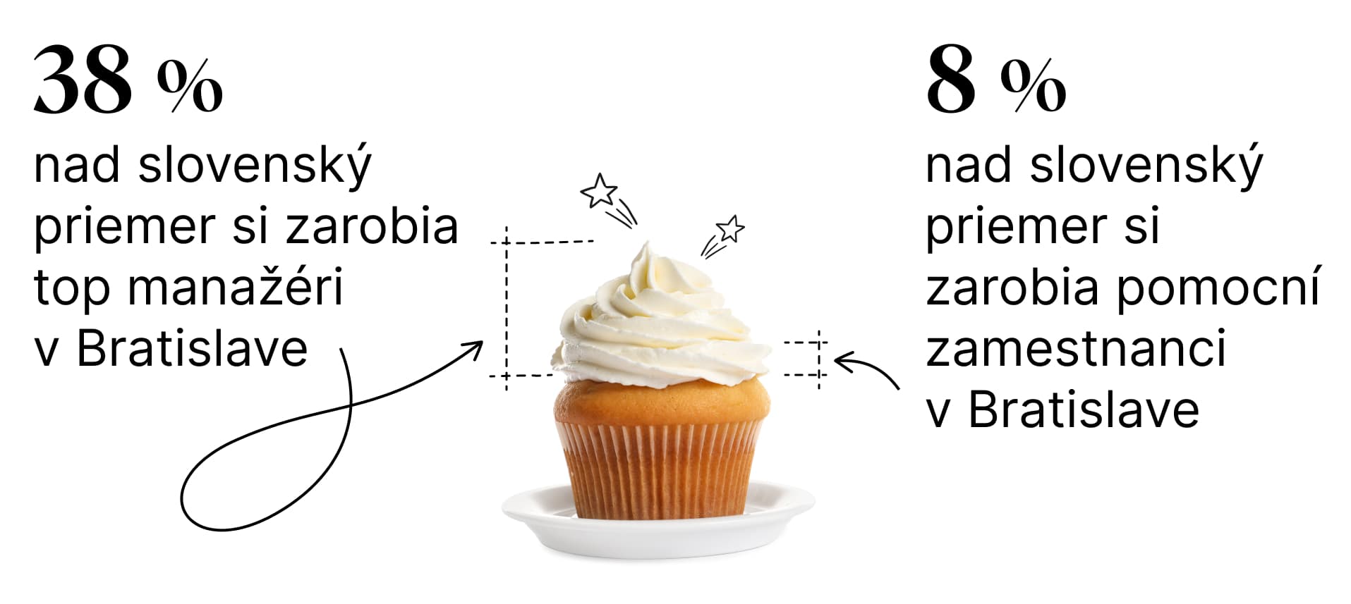 Pri porovnávaní úrovne platov za 2. kvartál 2024 v Bratislavskom kraji s priemerom Slovenska, je vidieť výrazný odstup hlavného mesta od zvyšku Slovenska. Najlepšie si v porovnaní so slovenským priemerom vedie kategória Top manažéri, ktorí tu zarábajú až o 38 % viac, než je slovenský priemer, a v roku 2024 ich mzda dosiahla úroveň 4 838 EUR. Najhoršie v Bratislave a okolí sú na tom naopak zamestnanci v kategórii Pomocní zamestnanci, ktorí si zarobia o 8 % viac, ako priemerný Slovák pracujúci v tomto type zamestnania a ich mzda dosiahla úroveň 1 102 EUR. V ostatných pracovných kategóriách sa zarába v rozmedzí 17 až 28 % viac, ako je slovenský priemer.