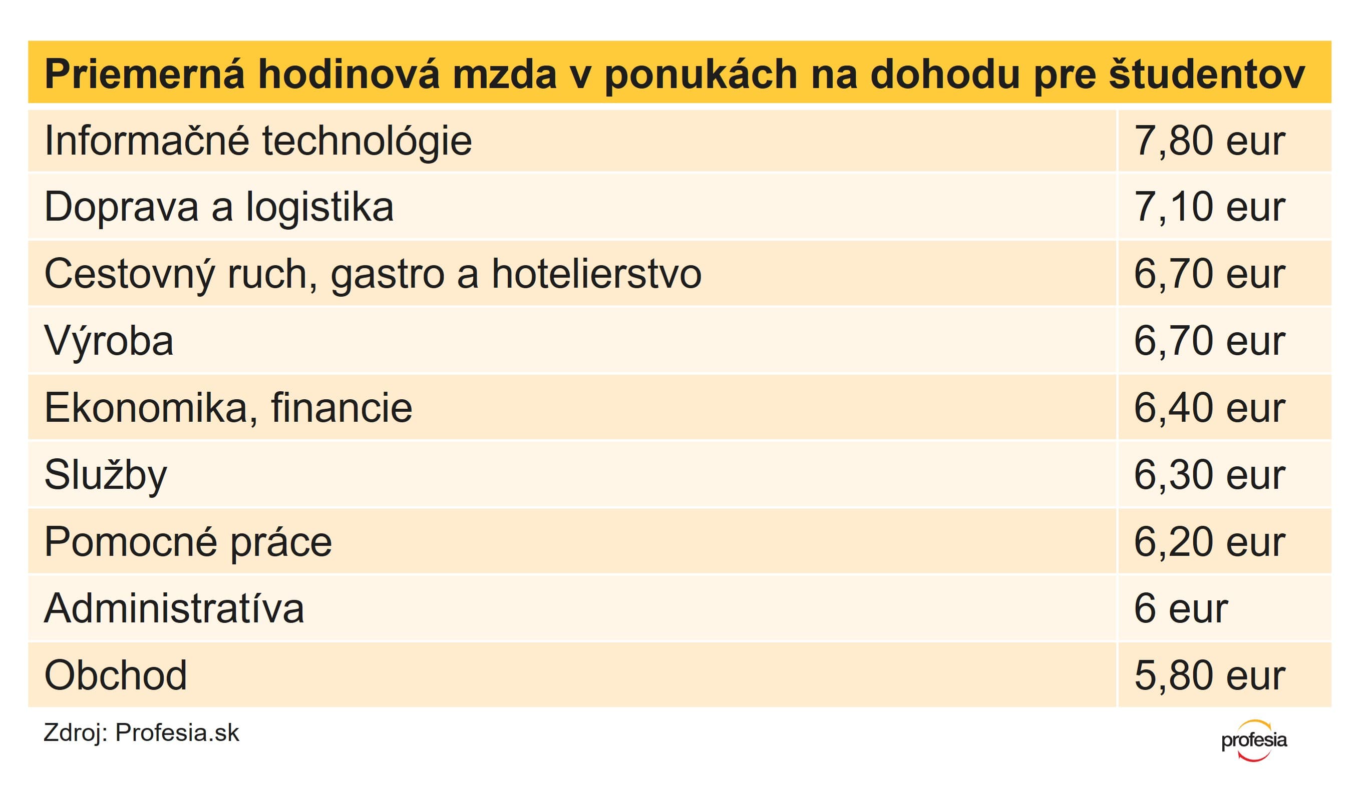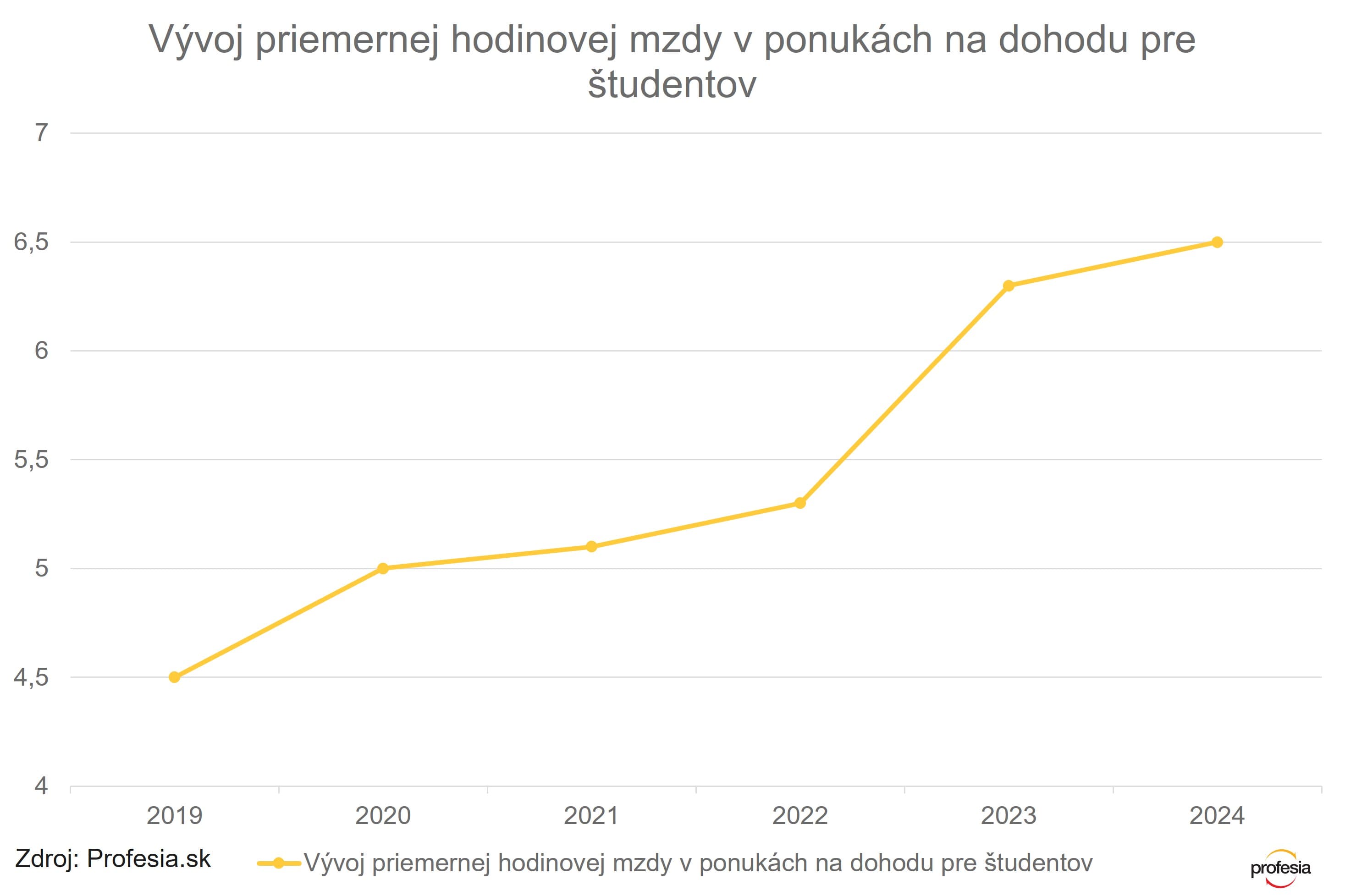 Aktuálne je priemerný plat v ponukách na dohodu pre študentov a študentky stredných a vysokých škôl 6,50 eur na hodinu. Oproti minulému roku je to len mierny nárast - o 20 centov, v porovnaní s rokom 2019 stúpla priemerná hodinová mzda o 2 eurá.