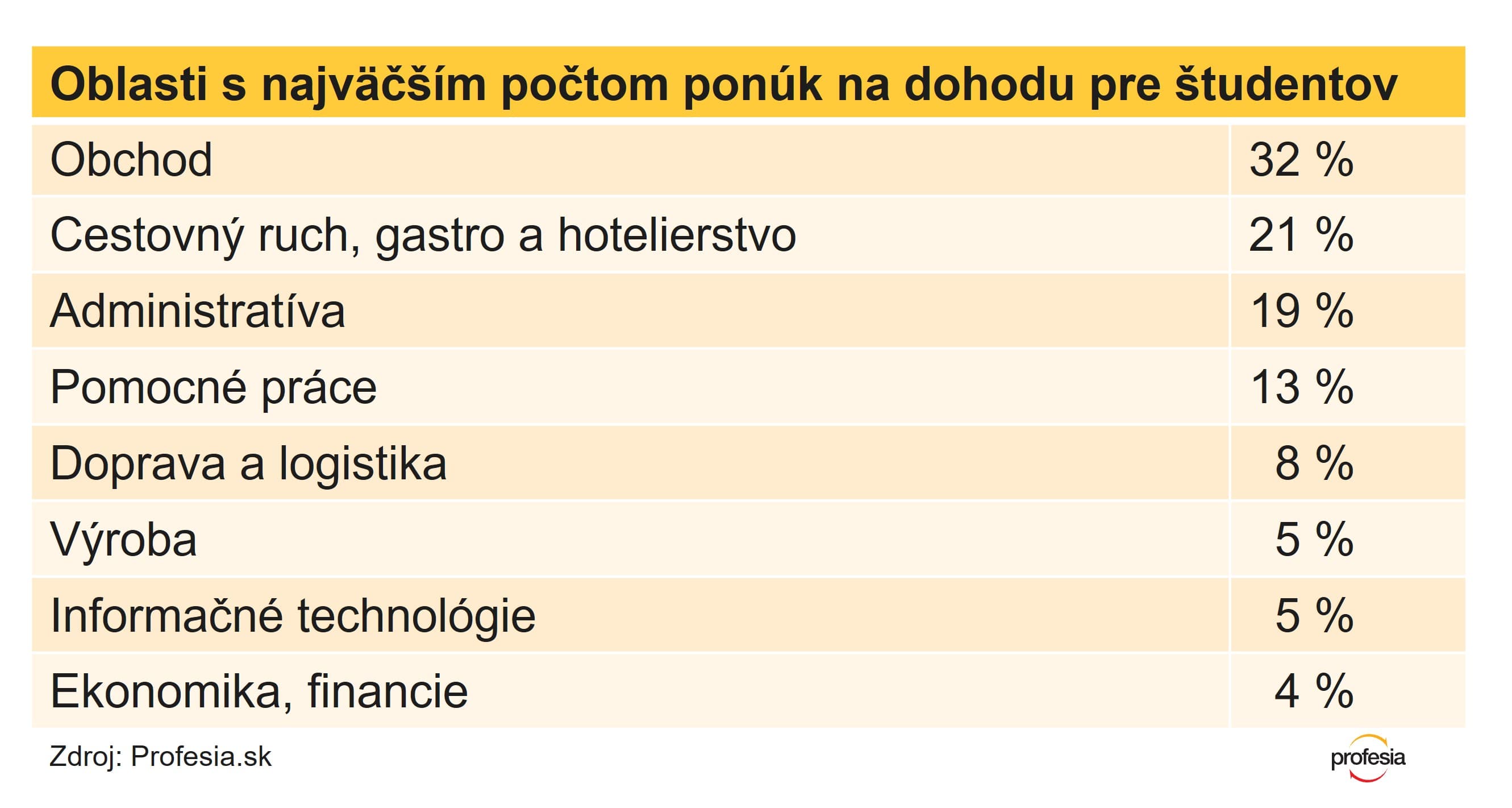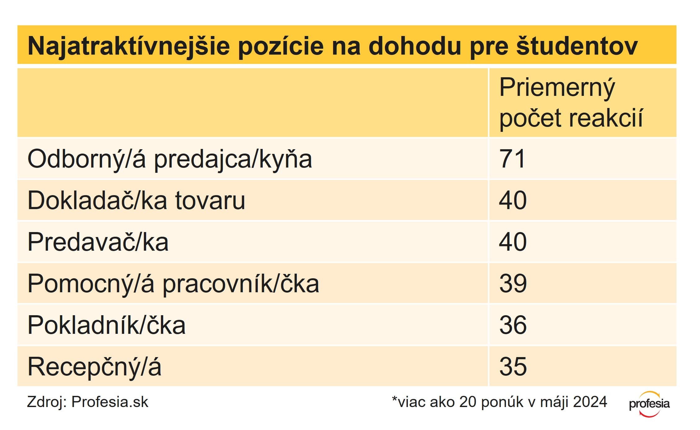 Najväčší záujem je práve o brigády v obchodoch, na jednu ponuku reaguje v priemere 32 ľudí, nasledujú pomocné práce, doprava a špedícia a výroba. Najväčšia konkurencia je medzi študentmi a študentkami pri pozícii odborný predajca, na jeden inzerát prišlo v máji v priemere až 71 reakcií. Vysoký záujem je aj o prácu dokladačov tovaru a predavačov.