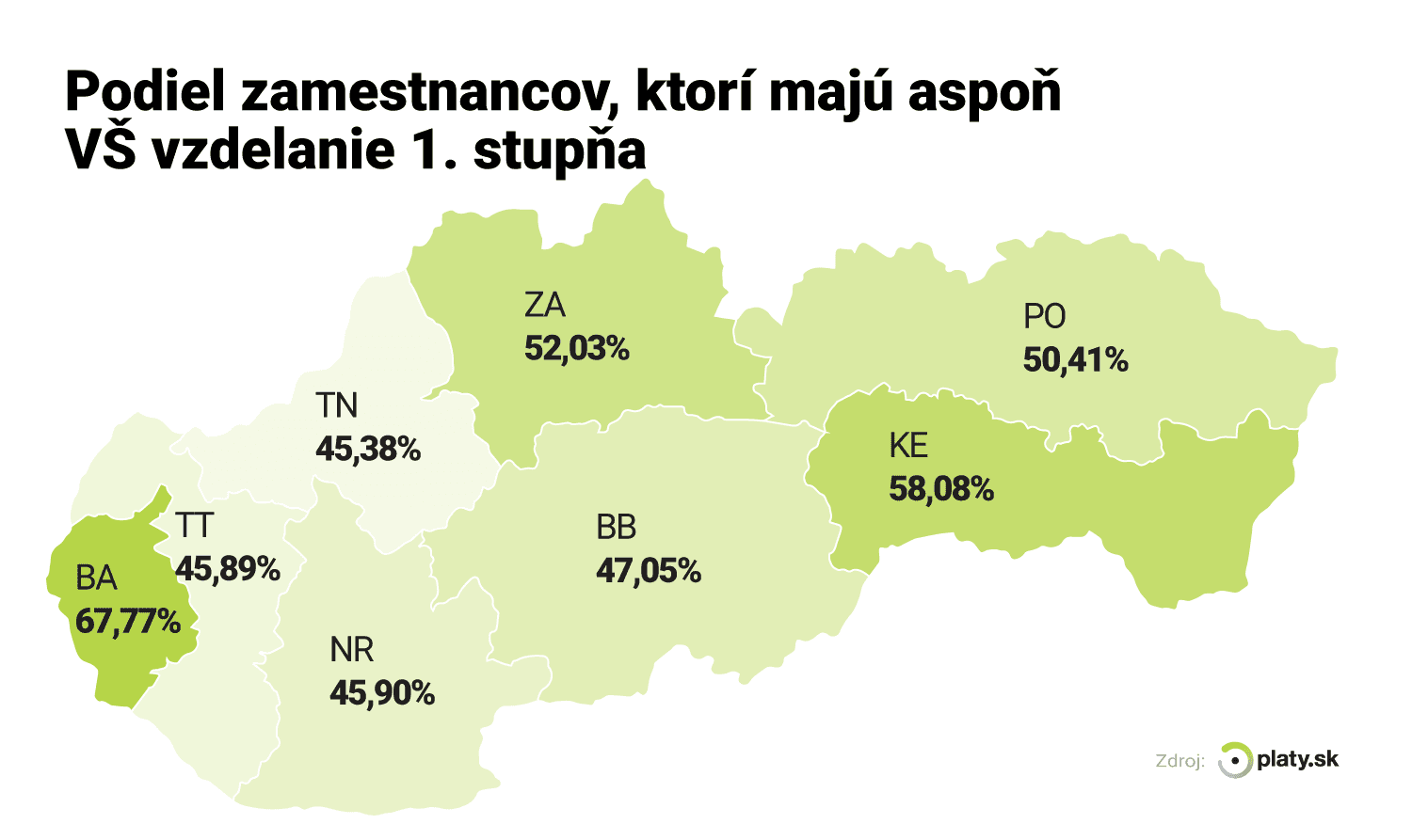 Nie je prekvapením, že najvyšší podiel zamestnancov s vysokoškolským titulom vidíme v Bratislavskom kraji. Spomedzi všetkých bratislavských pracovníkov ide o väčšinu, takmer 68 percent.