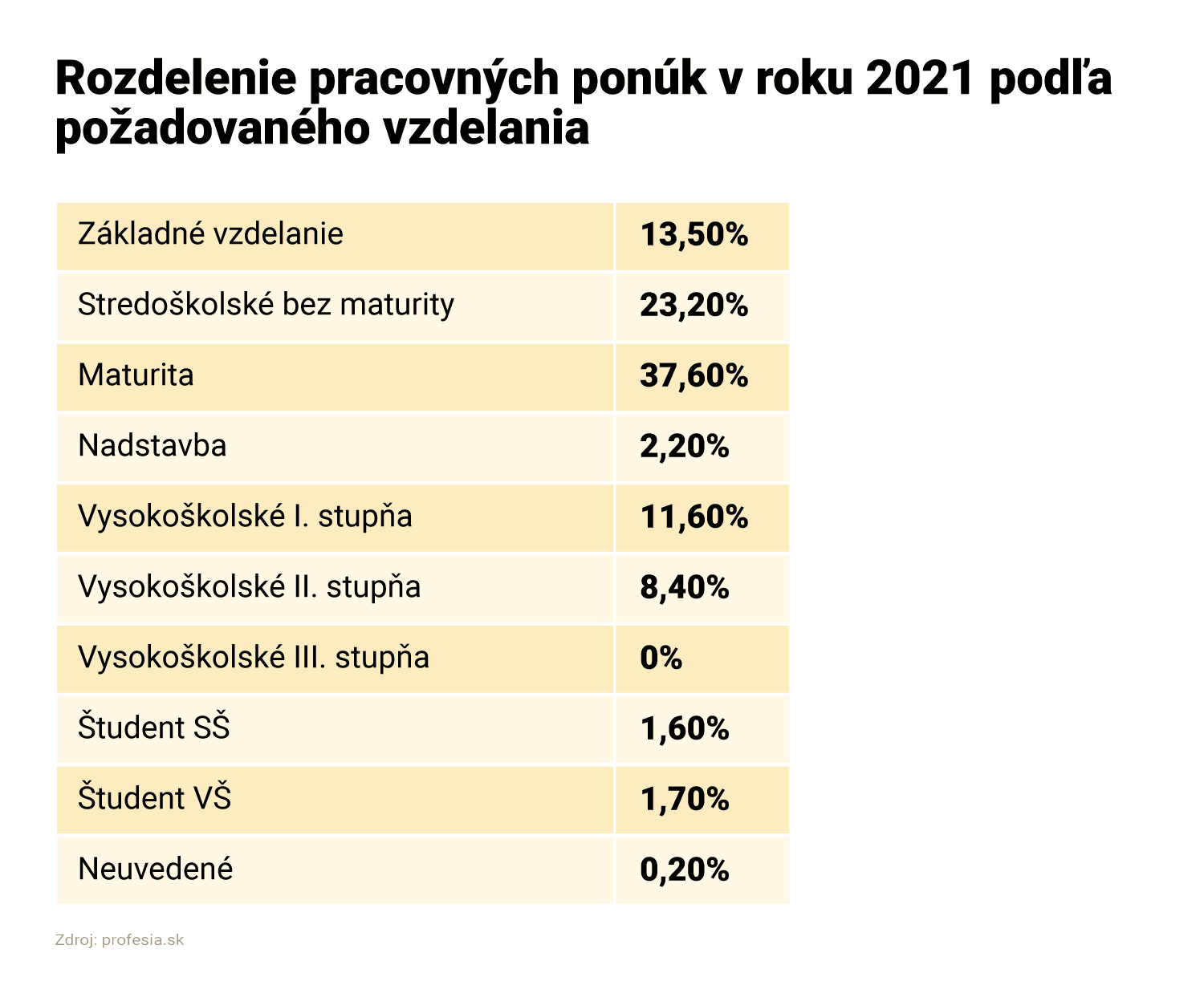 Najväčší pracovný portál Profesia.sk informuje, že najpožadovanejším vzdelaním na Slovensku je dlhodobo maturita. V roku 2021 je potrebná v takmer 38 percentách ponúk. Na druhom mieste je stredoškolské vzdelanie bez maturity, ktoré stačí zamestnávateľom vo viac ako 23 percentách inzerátoch.