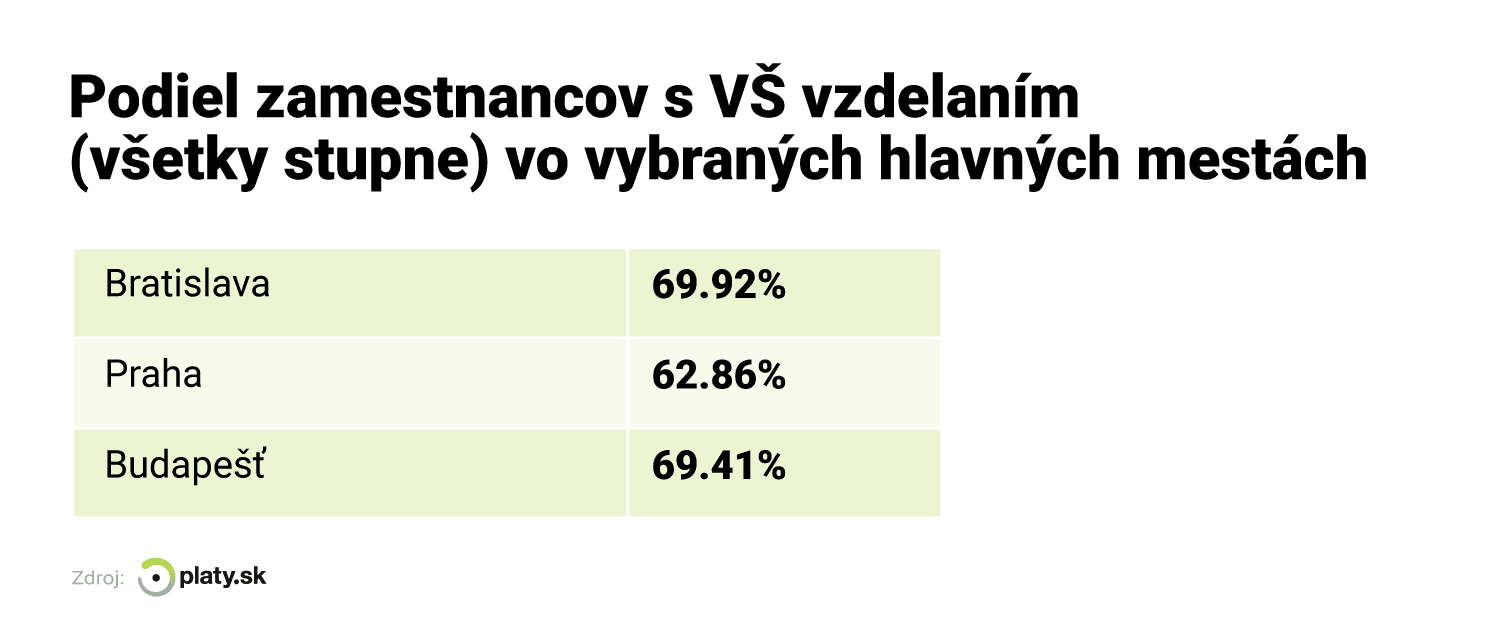 Analýza z dielne Platy.sk pracovala aj s údajmi z rovnakých platových porovnávačov v Českej republike (Platy.cz) a Maďarsku (fizetesek.hu). Spomedzi hlavných miest v troch krajinách nájdeme najvyšší podiel zamestnancov s vysokoškolským vzdelaním v Bratislave. Rozdiel medzi hlavným mestom na Slovensku a Budapešťou bol však iba minimálny.